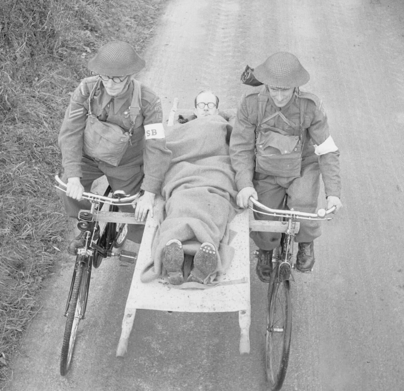 hello, I came across this image of a ww2 British home guard exercise involving something I’ve certainly never seen before, they have used 2-3 wooden batons (I would hope strapped or clamped) to 2 bicycles in order to put a stretcher with the “casualty“ on.