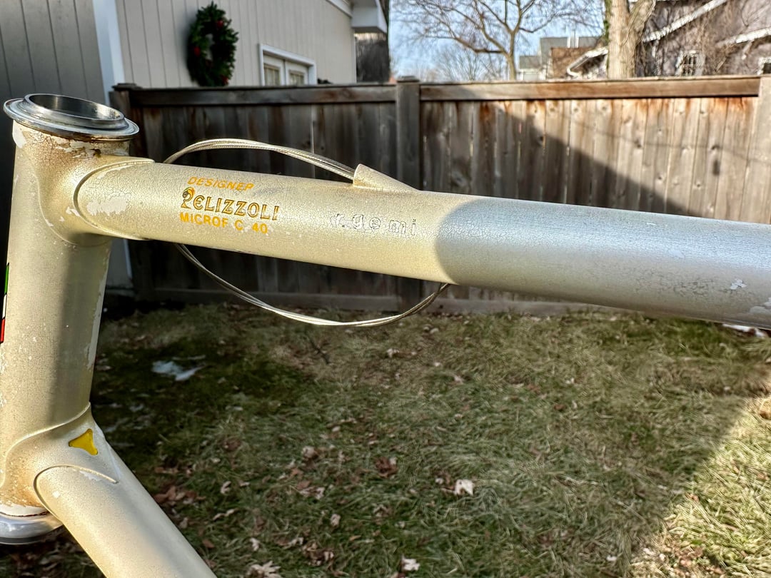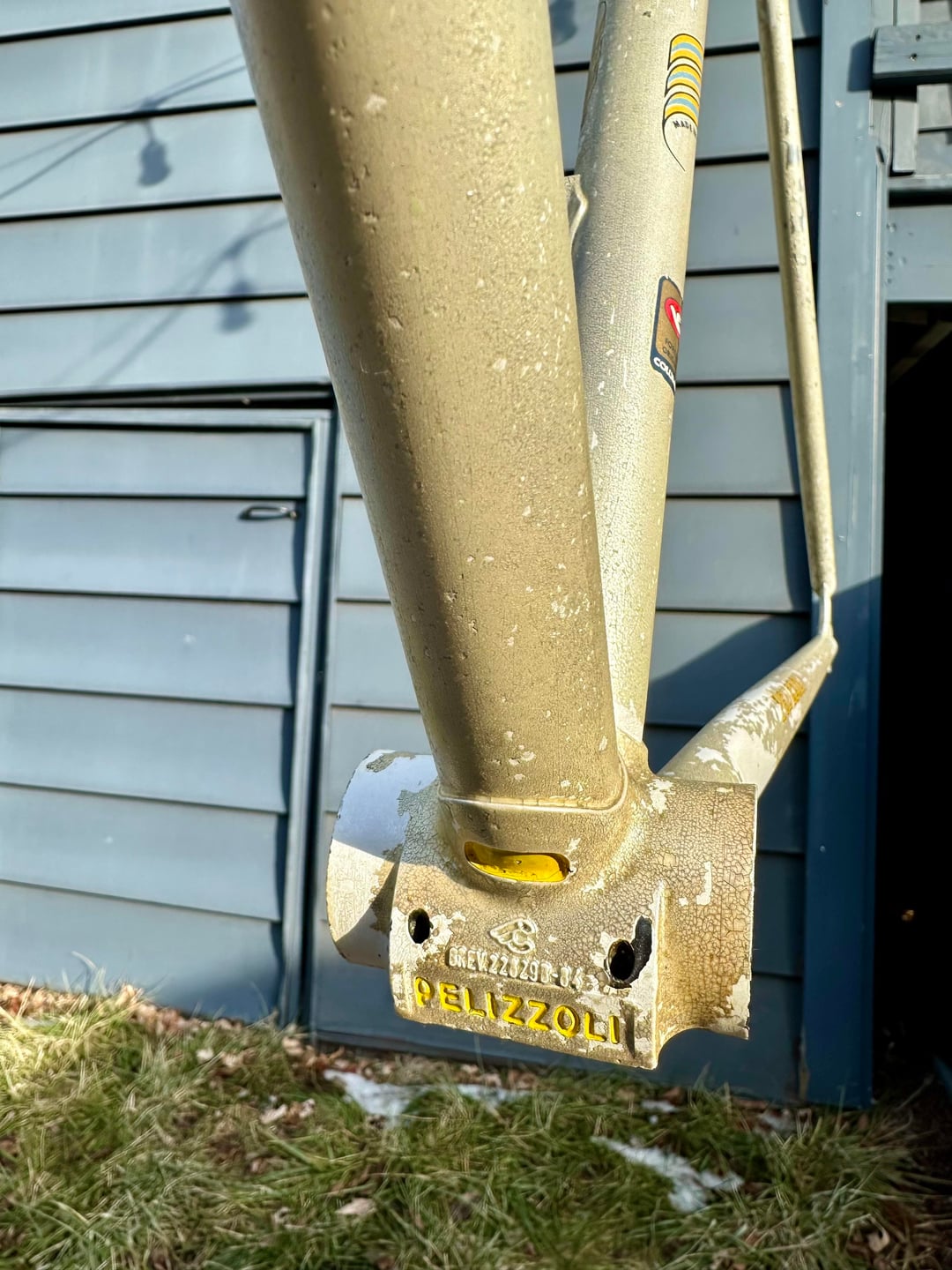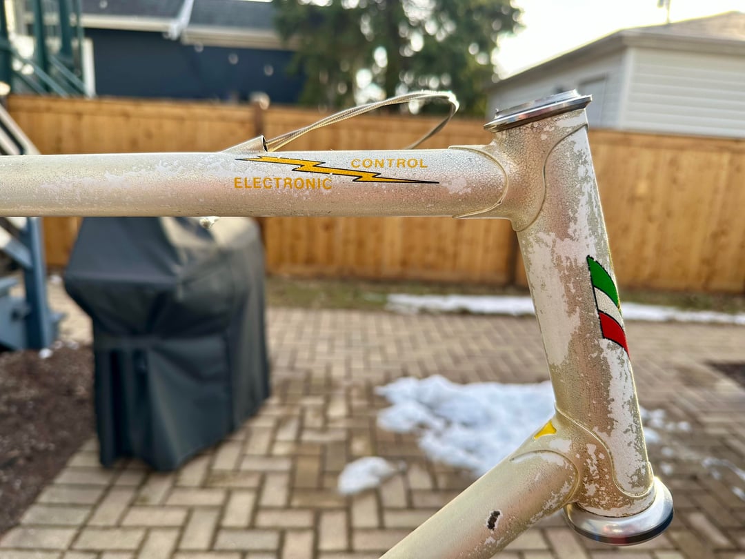 Since these pictures were taken I’ve carefully wet sanded, and the decals and patina look great. I’ll be trying to stabilize the original finish to prevent further flaking and preserve that patina before building it up… and I cannot friggin’ wait to do that. 🚲