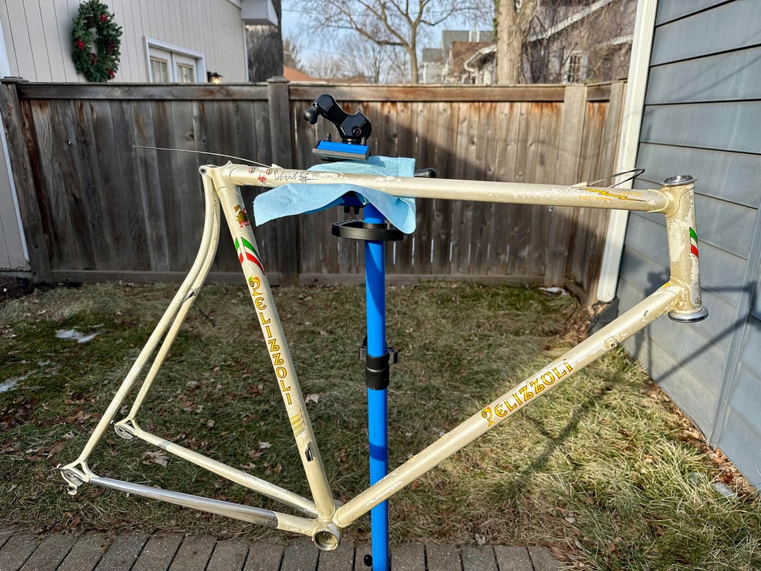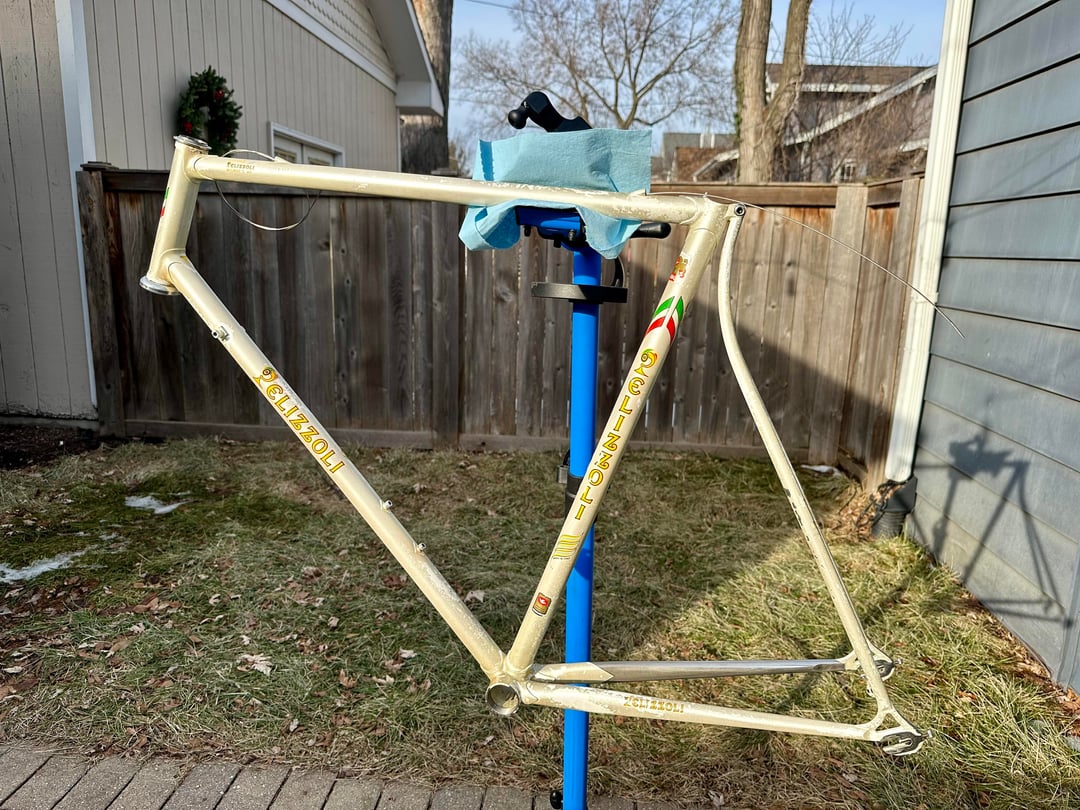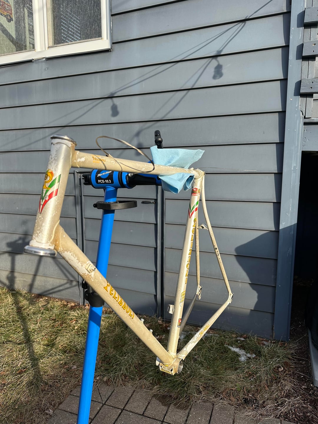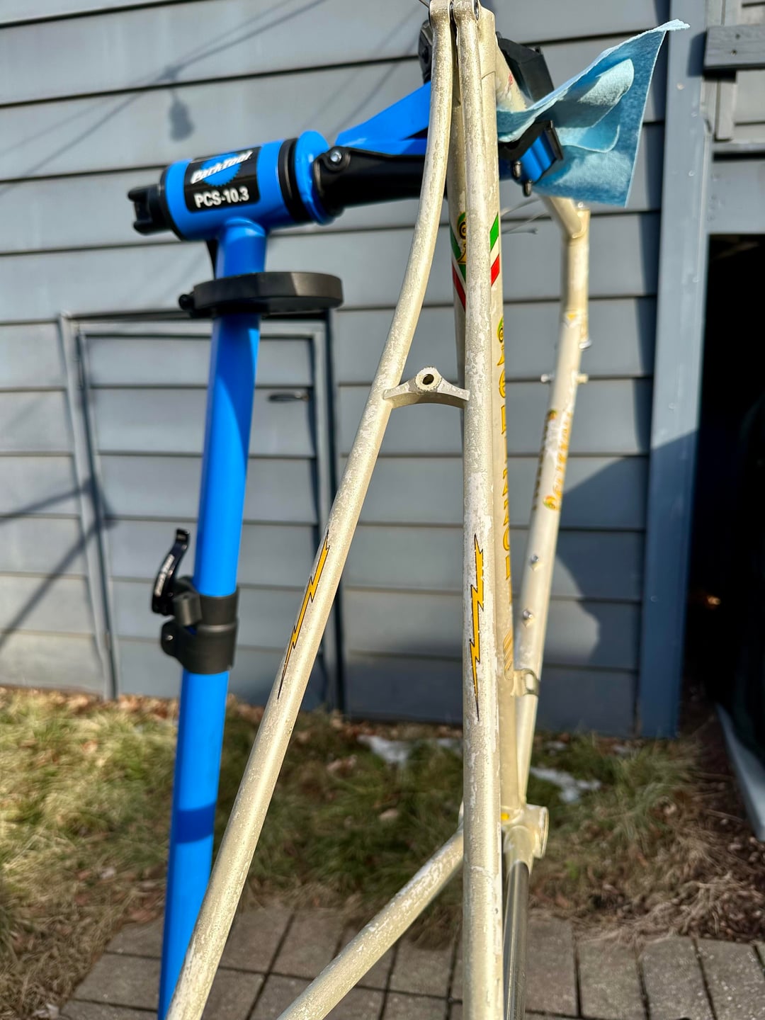 Since these pictures were taken I’ve carefully wet sanded, and the decals and patina look great. I’ll be trying to stabilize the original finish to prevent further flaking and preserve that patina before building it up… and I cannot friggin’ wait to do that. 🚲