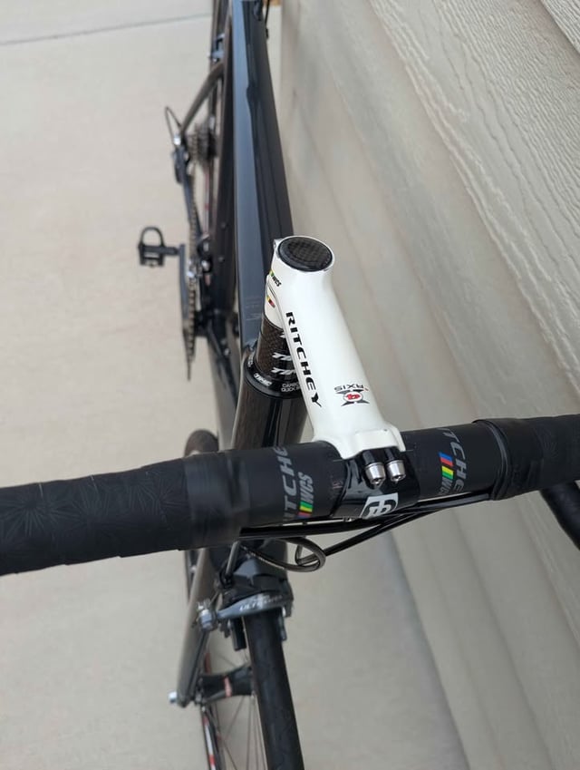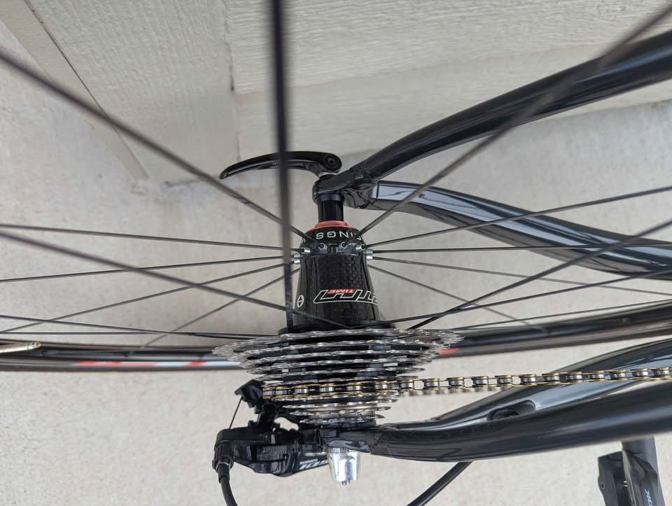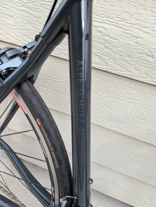 Time Alpe D’Huez 21 rim brake. Seller claims it is NOS (new old stock). In black I mostly see a [raw carbon layup](https://buycycle.com/en-us/product/time-alpe-dhuez-2168c0299ac5c35-10375). Also on the example I linked the UCI sticker is on the downtube. It being on the top tube is unusual. Since this is a high end climbing bike a raw carbon layup is a 100+ grams lighter than any colored paint. Though semigloss/low gloss black on black has been a trend that comes and goes. Do your due diligence. If you can get a serial number. It is usually on the bottom of the bottom bracket and see if Time is willing to verify the frame. Some high end brands do this because of the small but near constant supply of fakes.