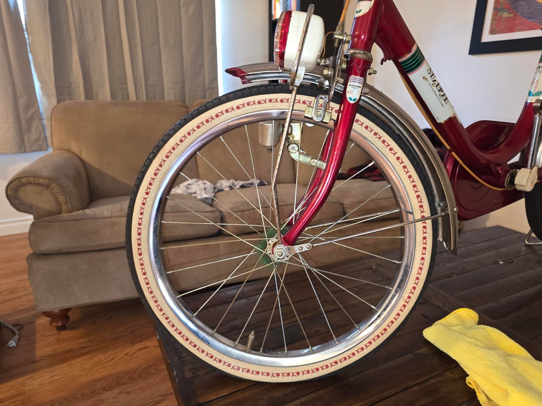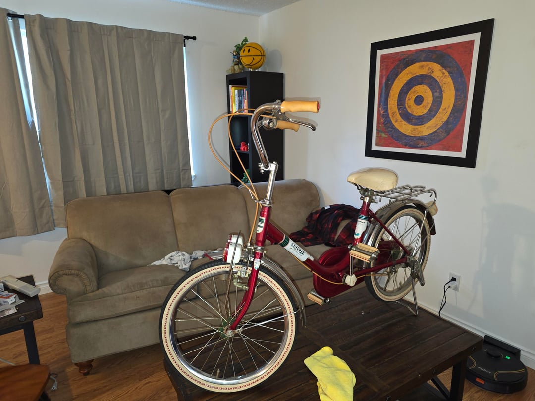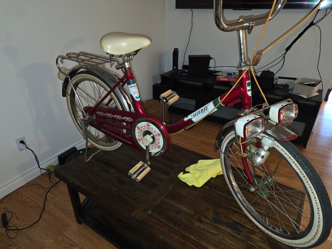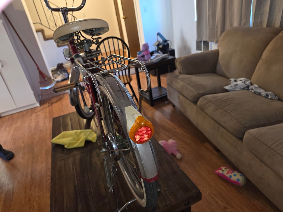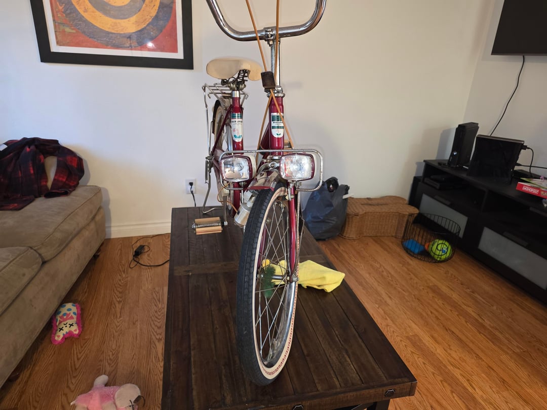 Hello all, I recently received this bike that has been hung up in my grandma's garage for probably about 40 years. My grandpa was a tugboat captain and he was ported in Japan and was gambling with some locals and won the bike. He tossed it in his hold and brought it back to the US. My grandpa died years ago, and he told me this story while he was alive when I asked about the bike. I gave it a very light wash with a microfiber cloth and some Dawn dish soap, there's still some surface layer rust on the chrome but it seemed to be coming off just by vigorously wiping the area. I've been using Google Gemini to get more information about the bike and its been fairly helpful, I've tested the Dynamo generator and it still functions but one of the bulbs was not working so I opened the headlight to see what kind of bulbs they were and found a black stamp inside of the housing saying 573, Gemini seems to think it indicates the bike or atleast the headlight housings were produced in 1982. The back tire holds air but the front one has a slow leak, so I ordered a new Dunlop valve and new tires in general because I want to preserve the original. I don't intend to ride this bike outside of just around my neighborhood block once to fully test everything, and because I'd be fulfilling a childhood dream as I've always kind of oogled over it hanging up. Gemini claimed this was a ghost bike likely assembled by a tradehouse who sourced parts, assembled the bike, and slapped their label on it. It claims all of the parts are very high quality though, Araya wheels, Panaracer silver star tires, MBS bike seat, Crane Bell Co. Mechanical rotory bell, Mitsuba generator. The frame is a mystery still, it has a label on it saying EBS but I'm not sure what that indicates. I figured I'd share this with some people that most likely know more than me about these sorts of things. Any pointers, care advice, or anything of that nature is much appreciated.