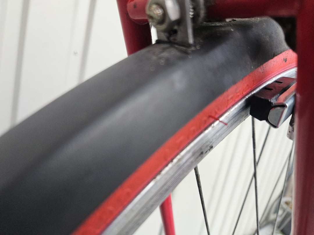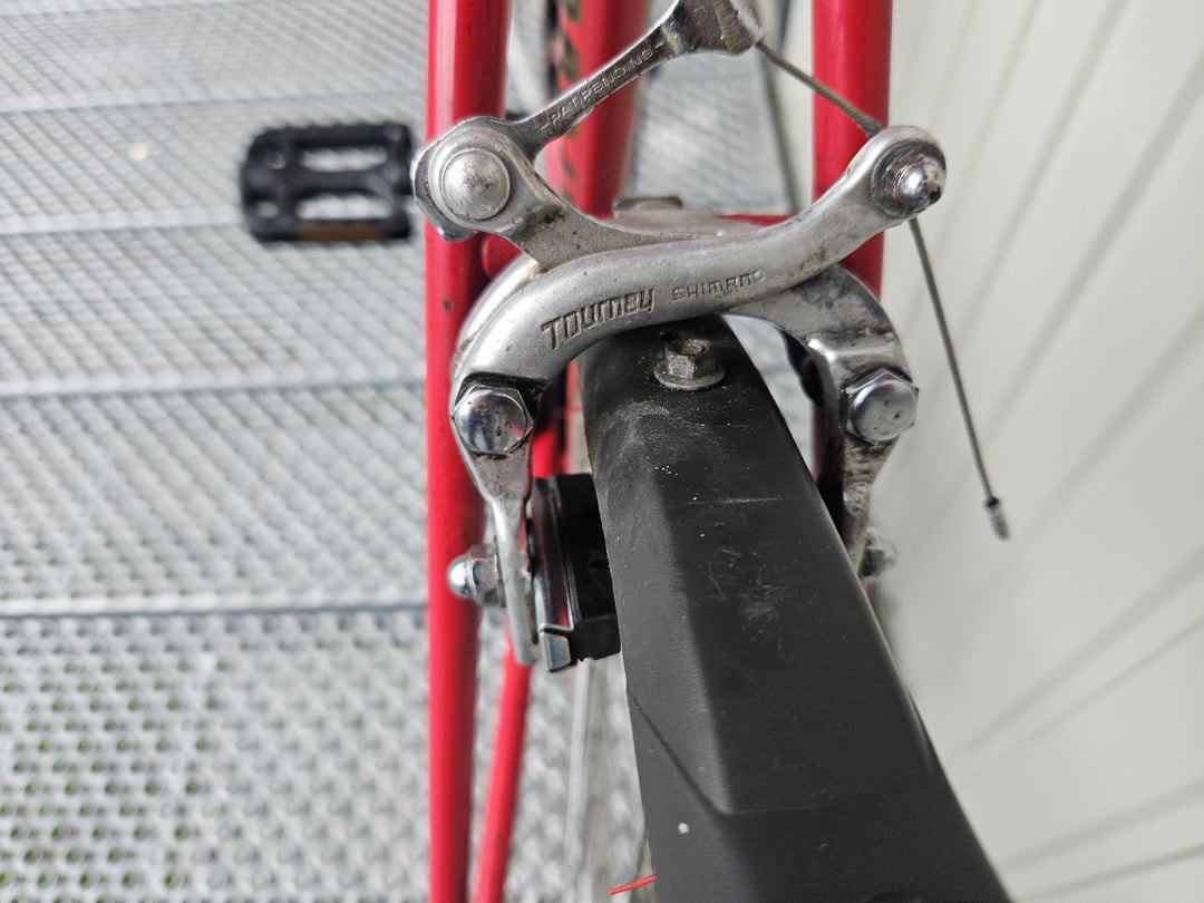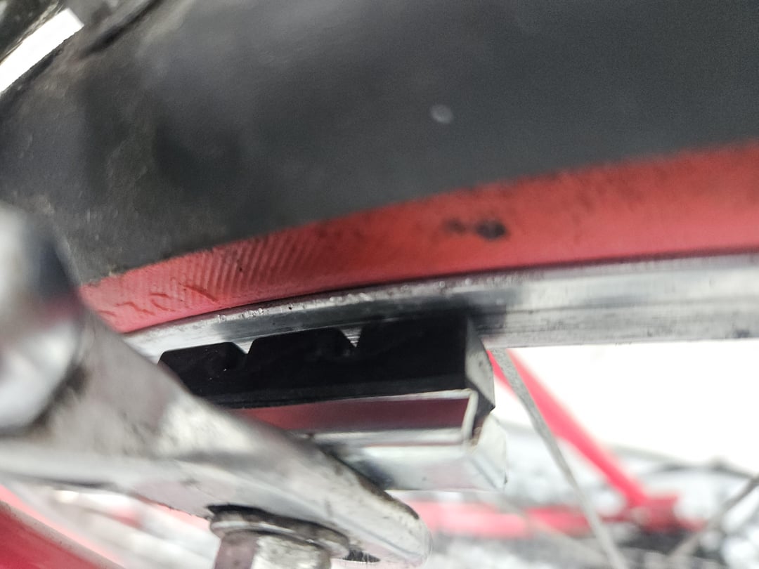 The problem is that the left brakepad on the rear doesn't hit the rim straight. Even with the cable adjusted so it barely doesn't touch the rim while not braking, pulling the brakes fully to the handlebar, the braking force is quite bad. The old braking pad was worn at this angle, so they actually braked much better than the new pads.