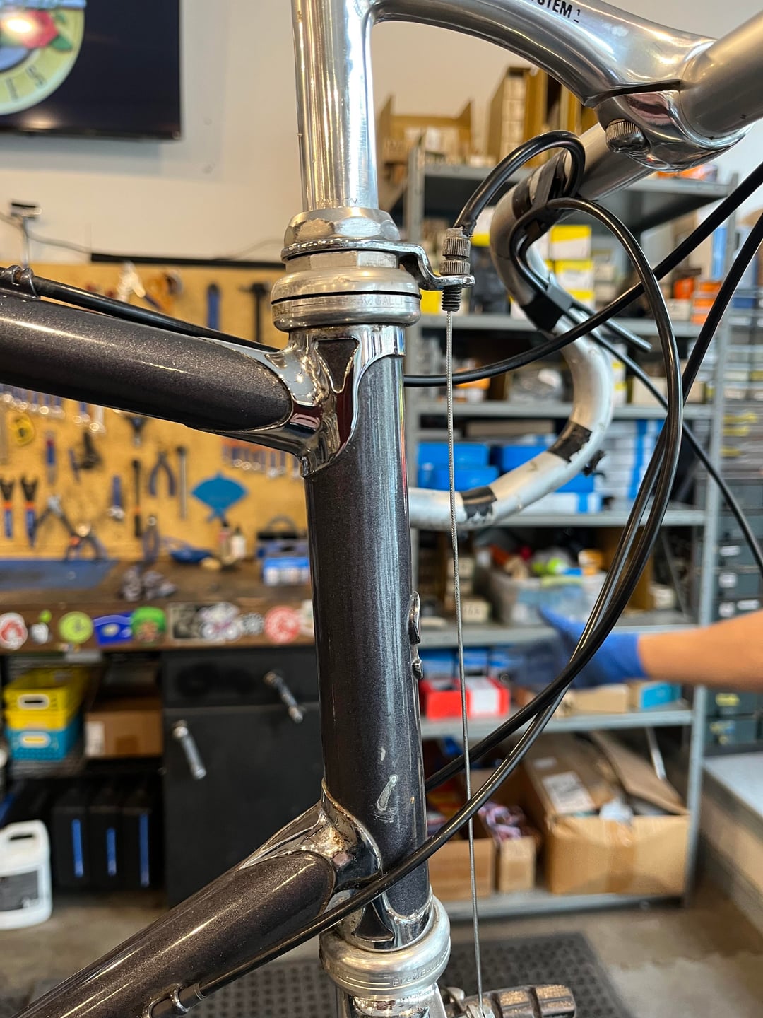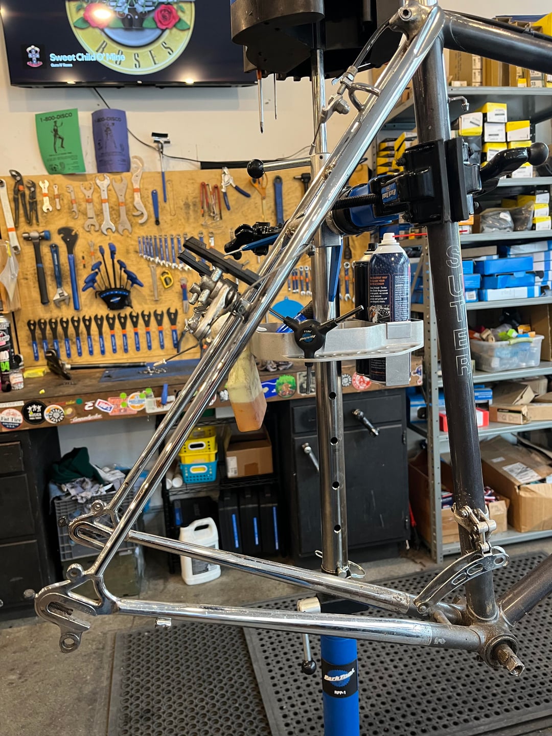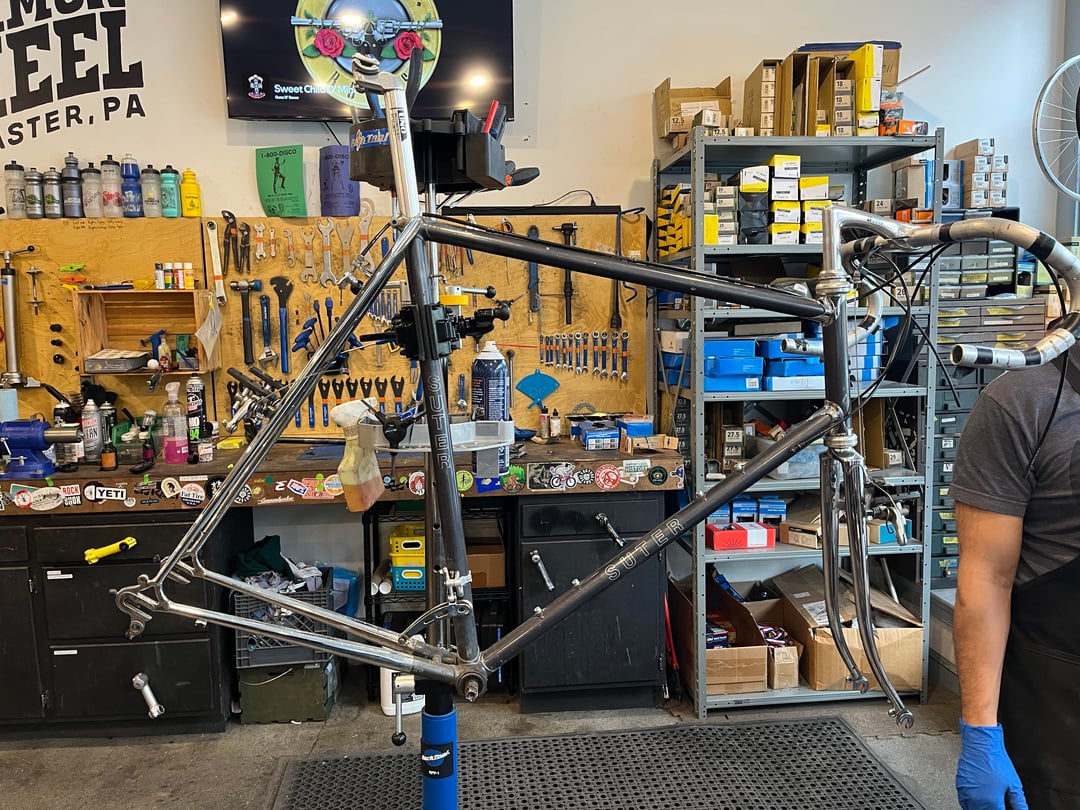 I volunteer @ a bike co-op in Lancaster, PA. A gentleman who lives in Philly stops in occasionally to browse for random high quality bits. He stopped in yesterday and donated this frame. Never heard of the maker and a cursory iNet search yielded only a niche 2cycle motorcycle manufacturer. It’s a gorgeous frame. I only wish I was four inches taller😕🥰