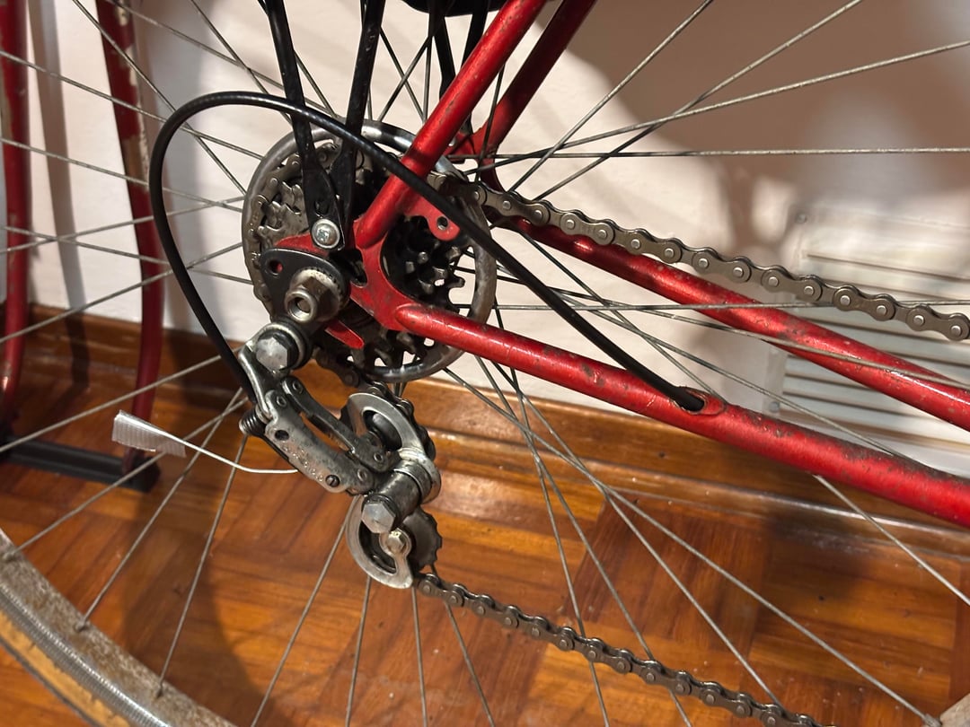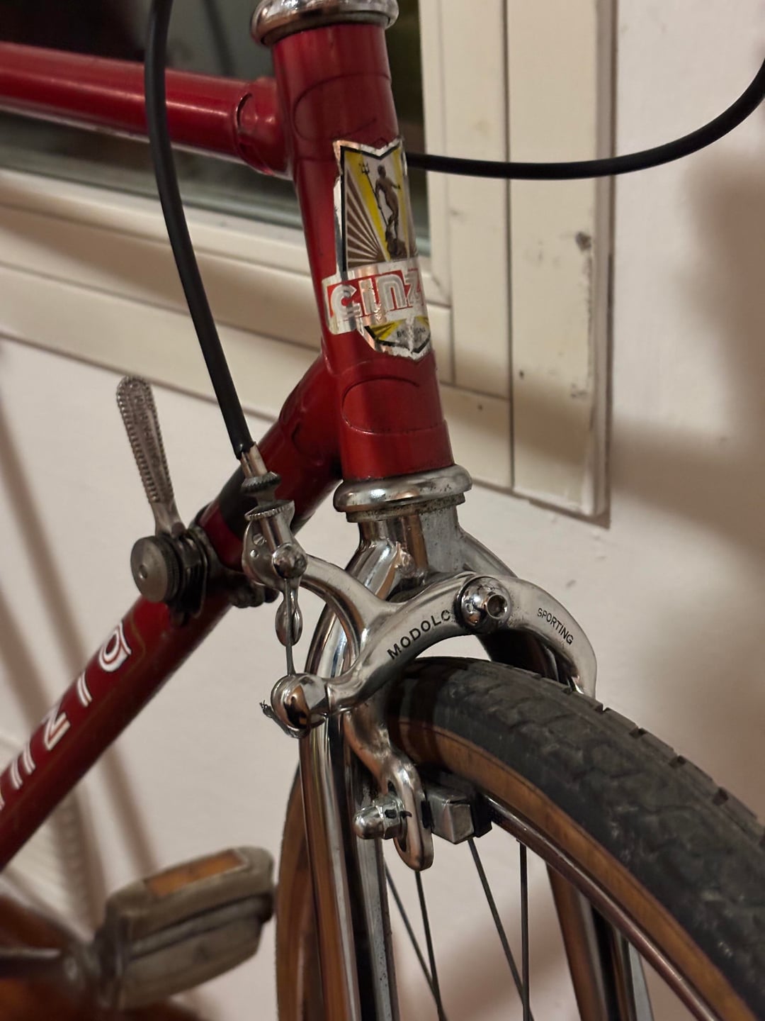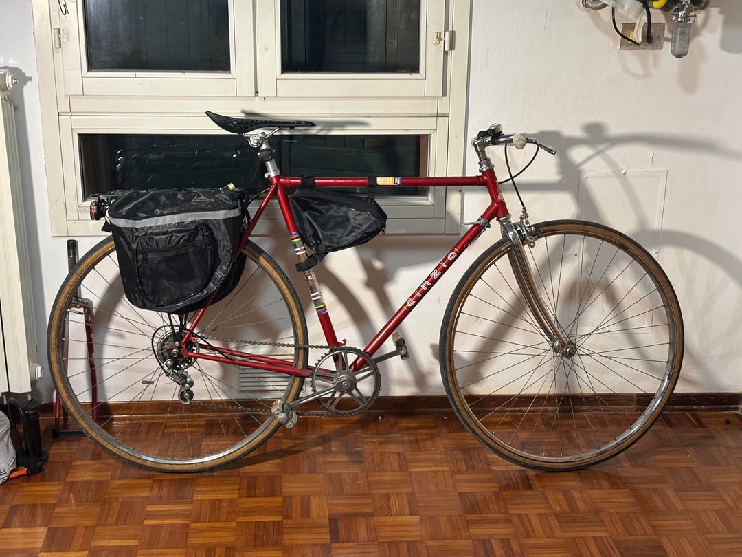 The bike is a 1971 Cicli Cinzia (small italian frame maker) with Campagnolo derailleur and shifter, iron rims and Modolo sporting brakes.