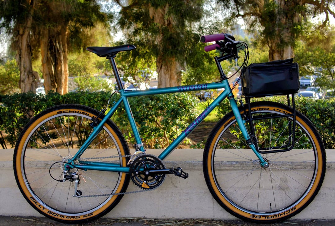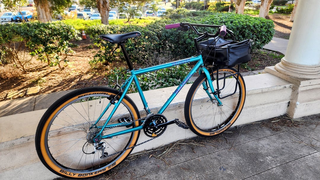 Came with matching Specialized Pizza Rack and bag. New V Brakes, cassette, chain, and full Velo Orange Klunker cockpit, with new levers and shifters.