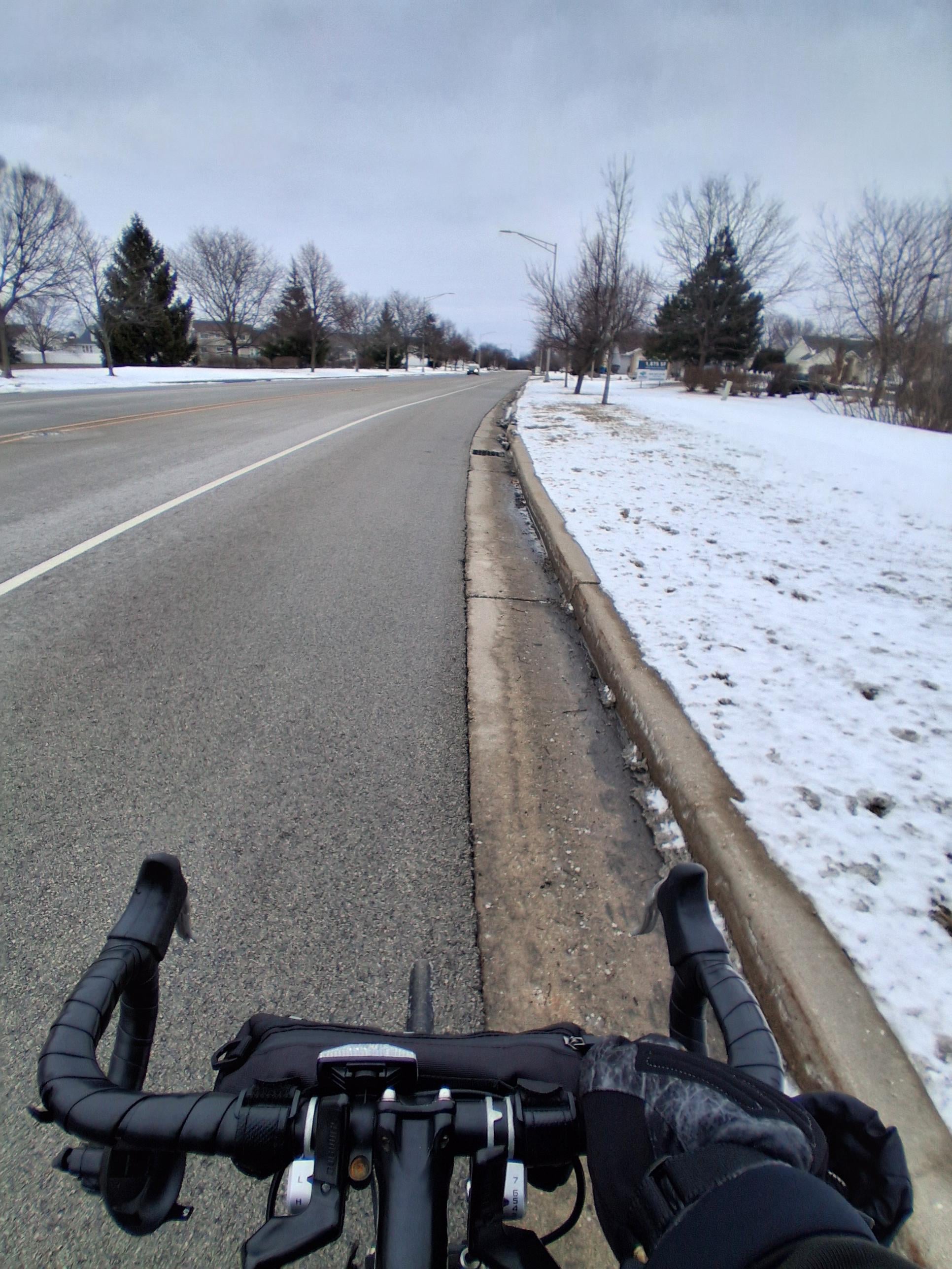 Coldest I've done up to this point was 30°F on a clear day. I keep telling myself I'll figure out my clothing setup and street routes eventually – the bike path I use doesn't get cleared during the winter and I don't have the right bike/gear to ride through snow. My partner's car broke down the other day, so now my options are share the car in a very inconvenient way, or ride to work. Turns out the street route parallel to the trail is incredibly bikeable and has a nice wide shoulder for almost all of it. The 15°F weather was tolerable with the right clothes.