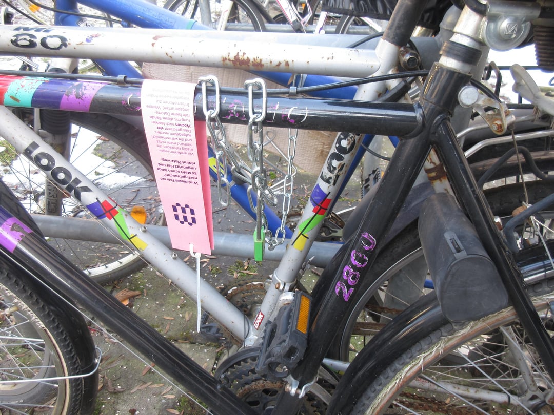 Da geht halt alle paar Monate wer rum, und hängt an alle Fahrräder (oder zumindest alle etwas runtergekommen aussehenden) so ein Ding. Einen Monat später werden die abgeräumt, bei denen das keiner abgemacht hat.