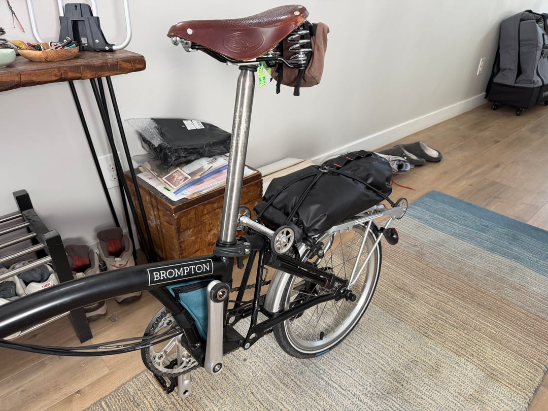 The winner has been the Blackburn Outpost 6.5L dry sack. It's a heck of a lot cheaper than the Brompton version and I wanted it to hold my rain jacket and pants– something I want to keep with me but I don't necessarily need to have at the ready. I found on the last trip that I only fold the Brompton when I take it inside the hotel. Even when we stopped for lunch, we just leaned our bikes next to something.