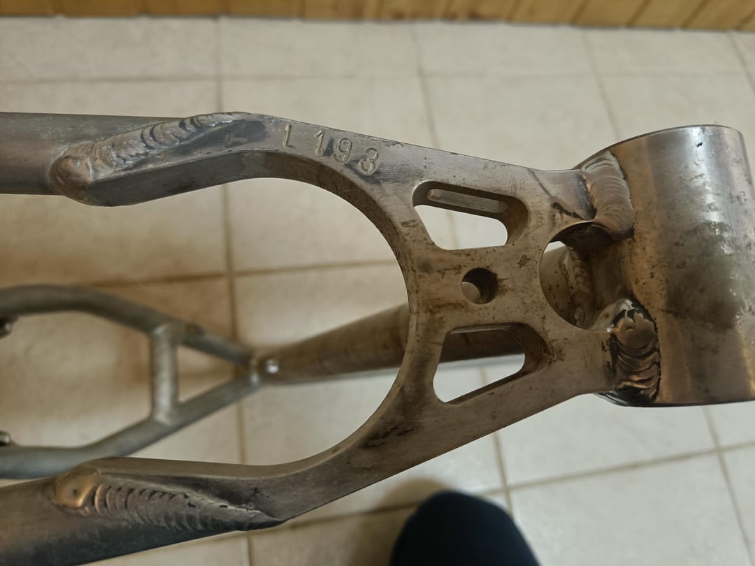 Bis auf "L198" unter der auffälligen Kettenstrebenbrücke gibt es keinerlei Markierungen. Rahmen ist eher leicht und die Hauptrohre sind vom Klang her auch eher dünnwandig – ist also tendenziell keine Baumarktware gewesen.