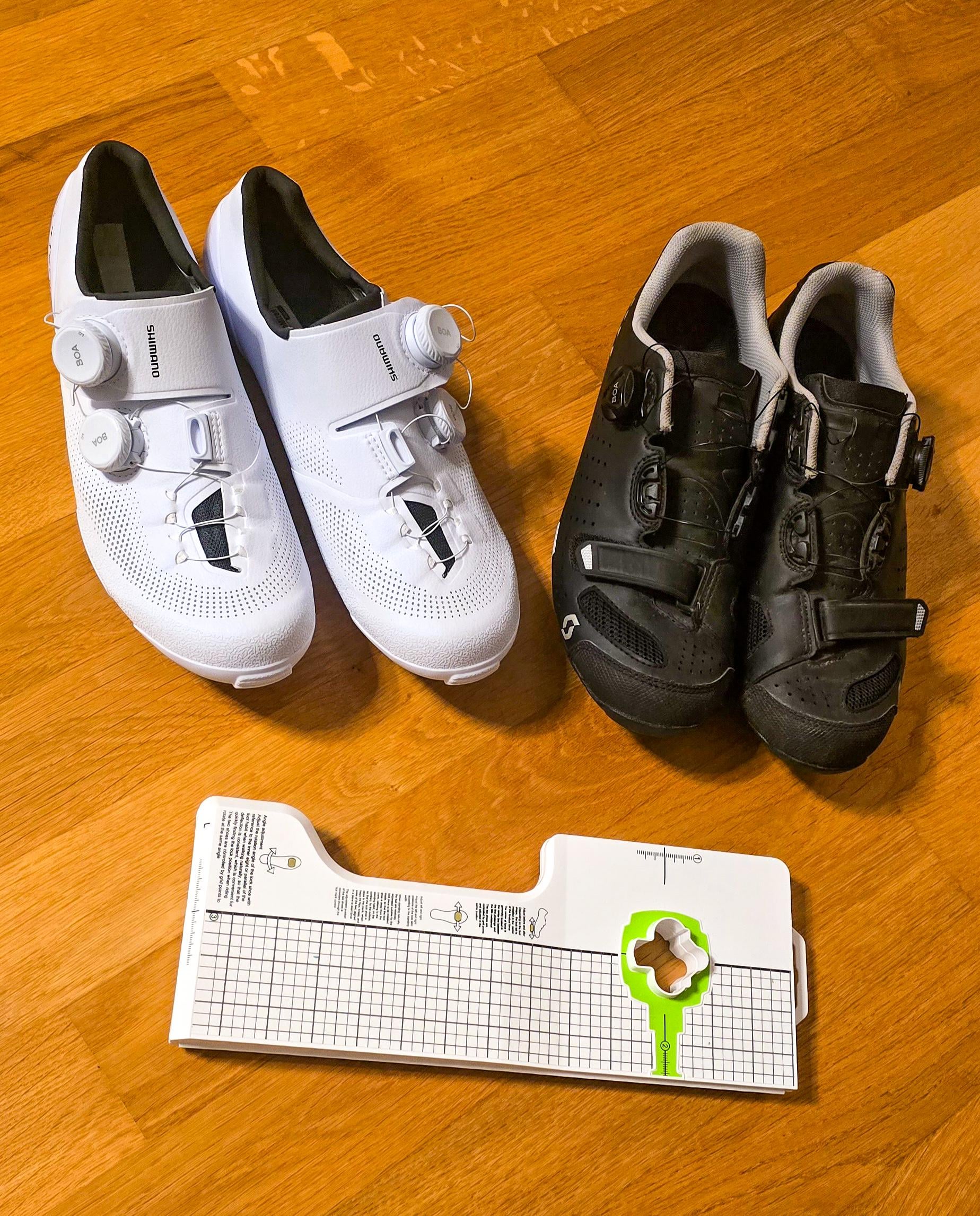 Ich habe mir neue Radschuhe gekauft (weiß). Die Cleats der schwarzen Schuhe wurden bei einem Bike fitting perfekt eingestellt. Wie kann ich mit dem Tool, welches auf dem Bild zu sehen ist, die Cleats meiner neuen Schuhe wieder exakt gleich einstellen? Vermutlich eine total dumme Frage, aber ich bin leider überfordert.