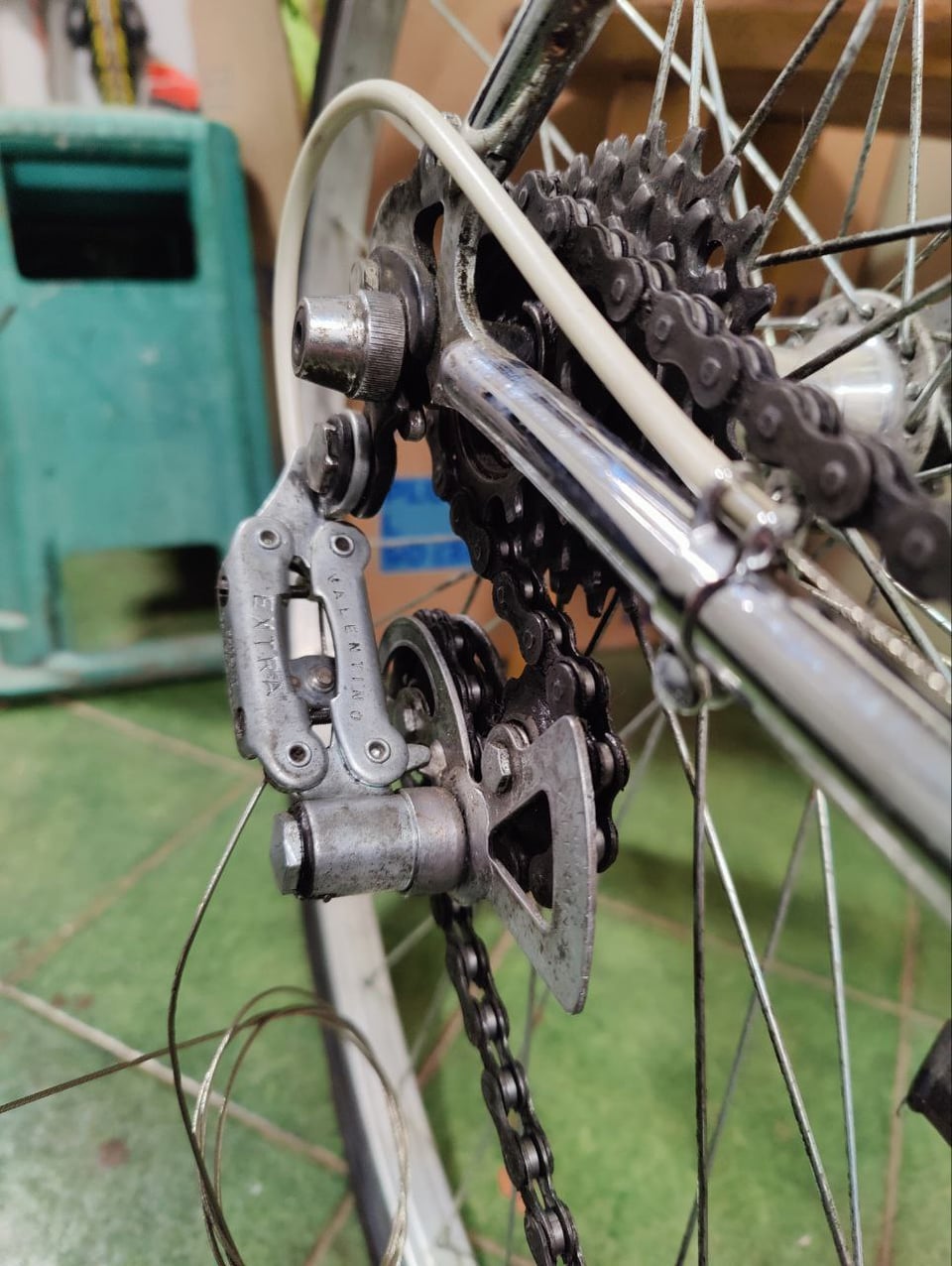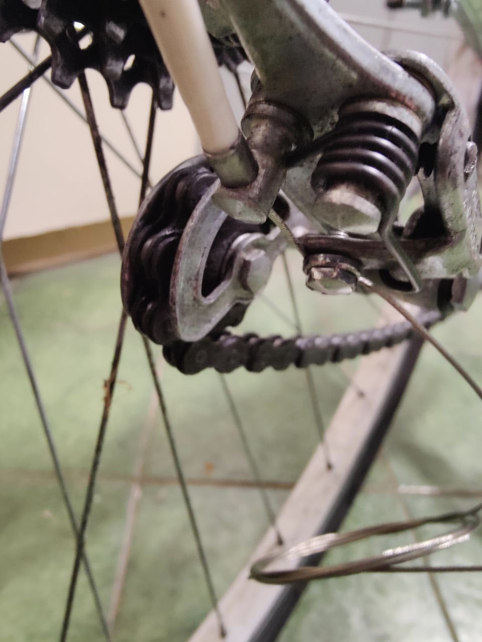 The rear derailleur (Campagnolo Nuovo Valentino Extra) was completely detached from the frame when I got it (just hanging on the chain), so I decided to take it off, clean and lube it, and then reassemble it.