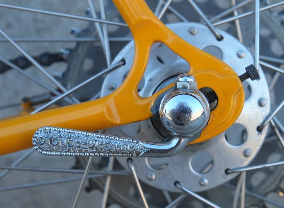 The original fork broke twice and was only repairable the first time. I bought a used Bianchi Columbus-tubing fork for it in 1993 and had the frame and fork repainted. 1993 was also when I built these wheels: Campy hubs (Record front, Nuovo Tipo rear), Mavic MA40 36-hole rims.