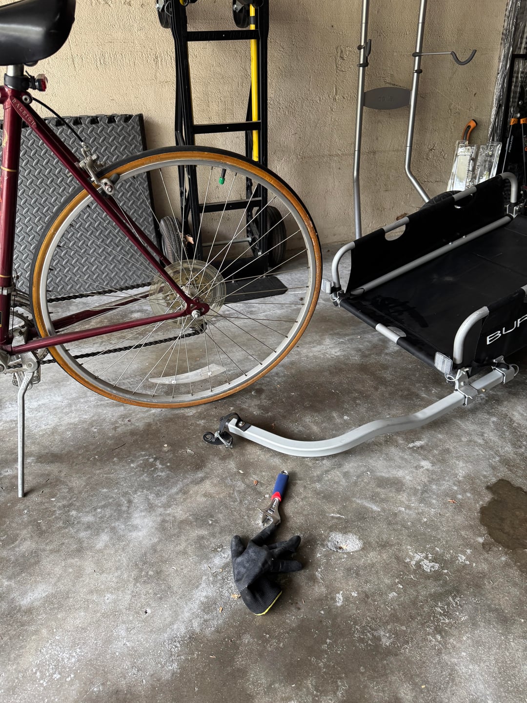Oh, and pull the pin and remove the trailer hitch before you do it, so you’re only dealing with the weird shaped piece of metal and not all the extra weight. Get the on bike park nice and level, and it’ll be easier to reattach the trailer with the PIN.