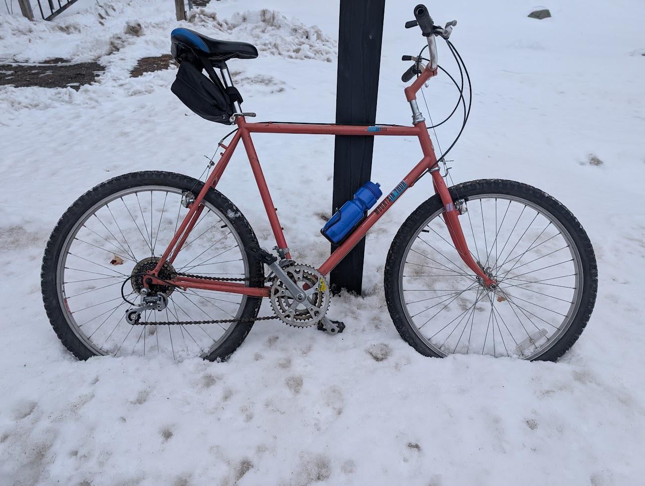 last week I tuned up the brakes and derailleurs on this 1987 raleigh mountain tour (my first vintage MTB) and last weekend it was only slightly below freezing so I took it for a spin with largely stock components, as far as I can tell. the tires are crap, the paths were crap, but I only put my foot down in deep snow and toppled over once. despite a bit of lube before I headed out, the derailleur got absolutely jammed with dirt and ice (hence the chainline in the photo) and that's when i had to call it quits lol. rinsed it out with water and then wd-40 to dry, don't worry… and yes, i will clean out the wd-40 and properly lube it.
