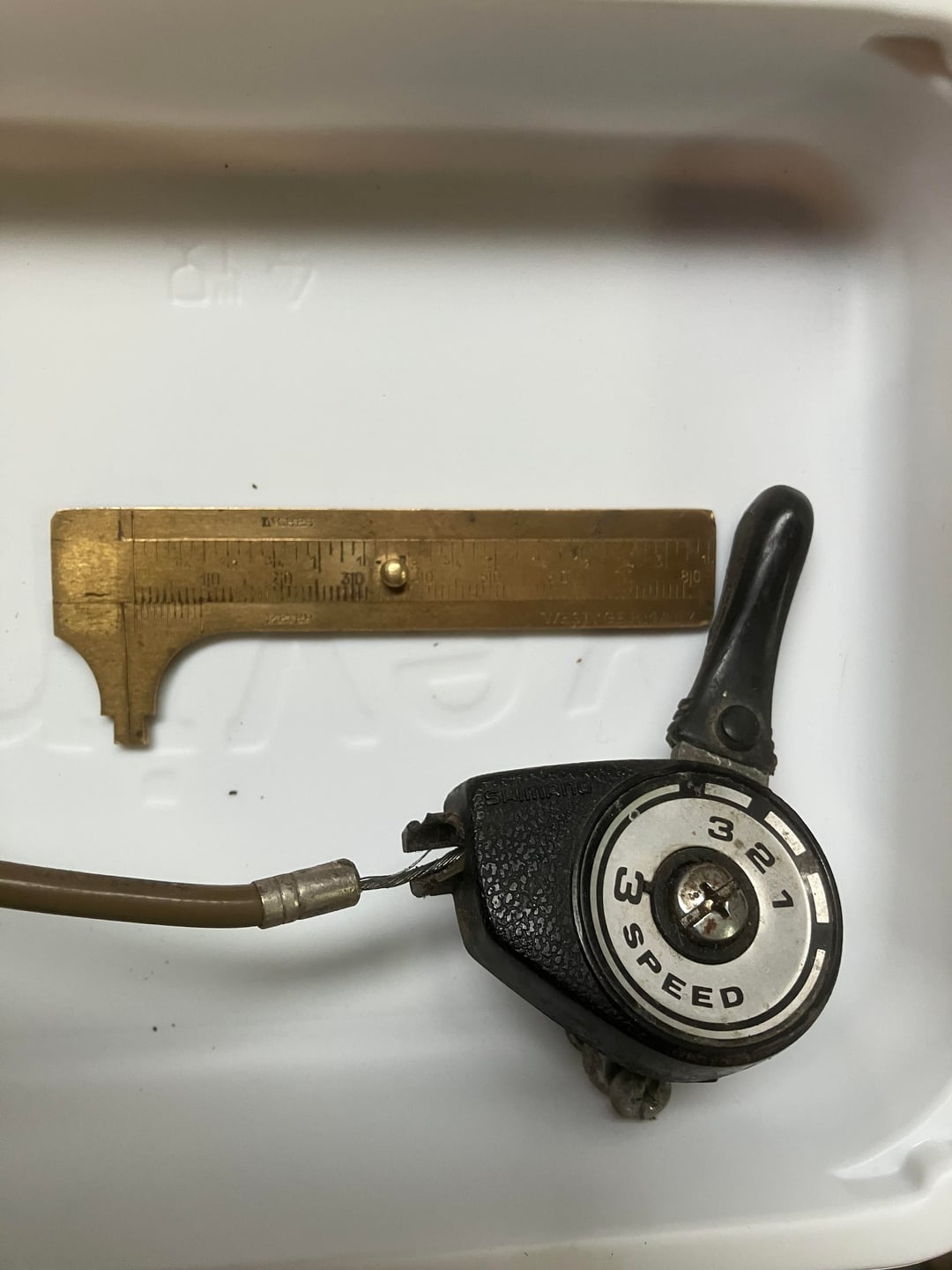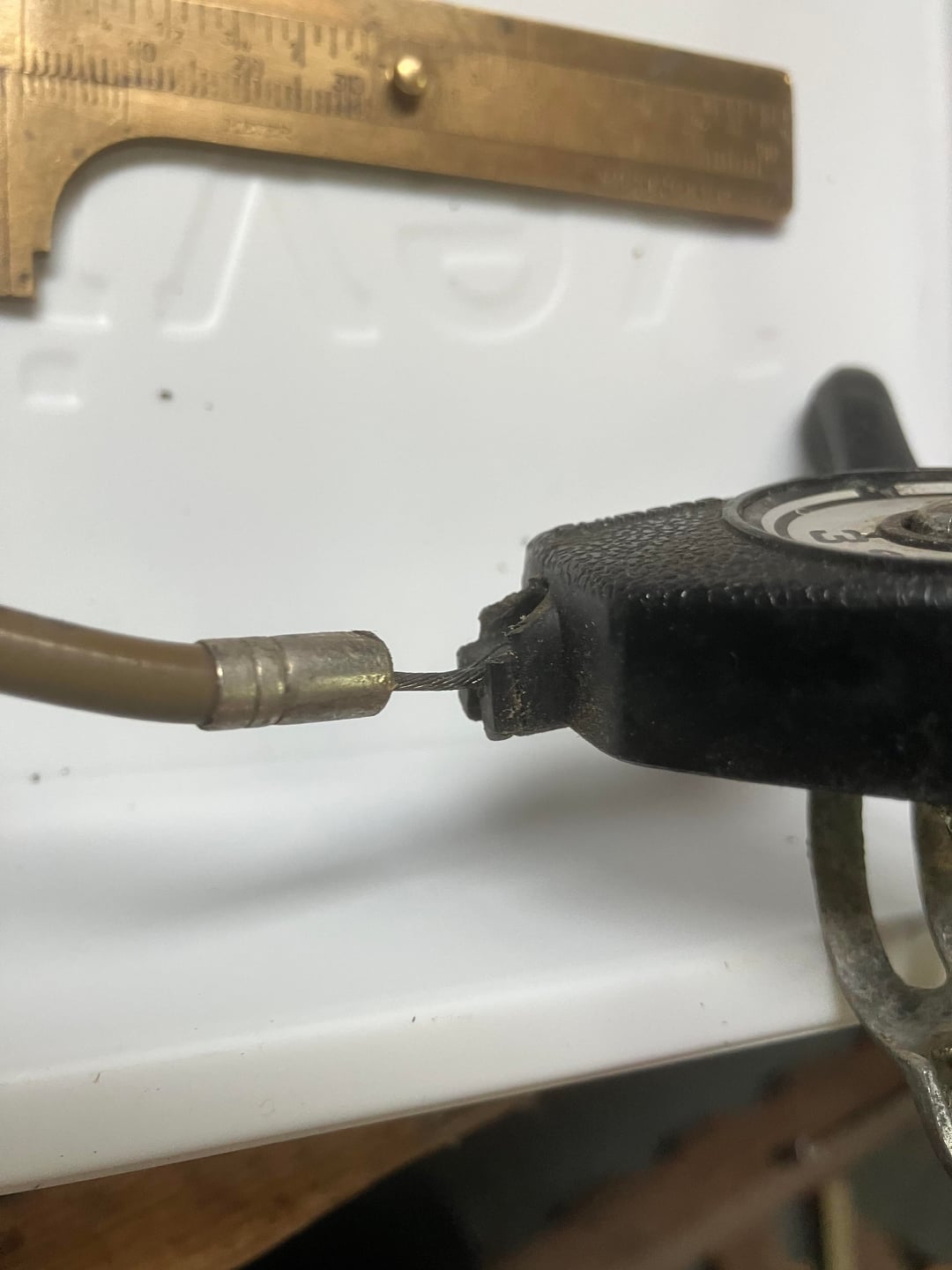 In my previous post, I mentioned a broken plastic housing on my 1970s Shimano 3-speed. Here’s some photos that show the broken housing. Please see the busted, black plastic shroud at the point where the cable enters the shifter. I was thinking that one of the contemporary twist grip shifters might be a good way to go, but I’m open to repair thots.