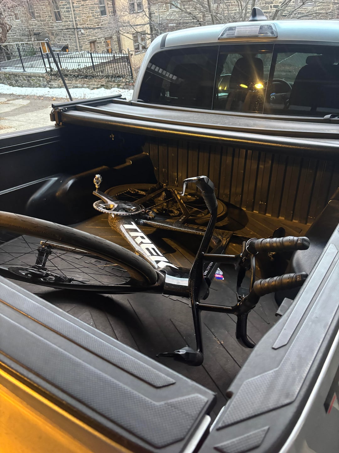 As the title says. For short distances, say under 10 miles typically I usually transport my Domane AL in a similar way in the 5’ bed of my truck (except the handlebars sit against the frame) which has always been fine. Drive side up always.