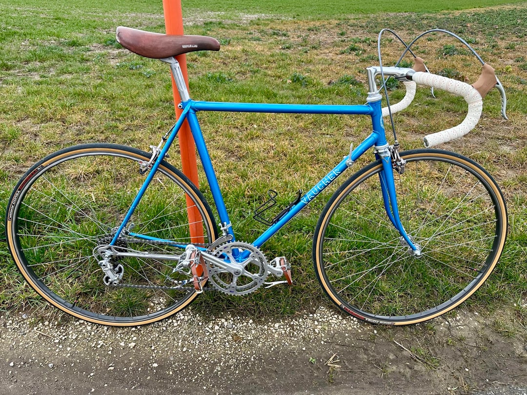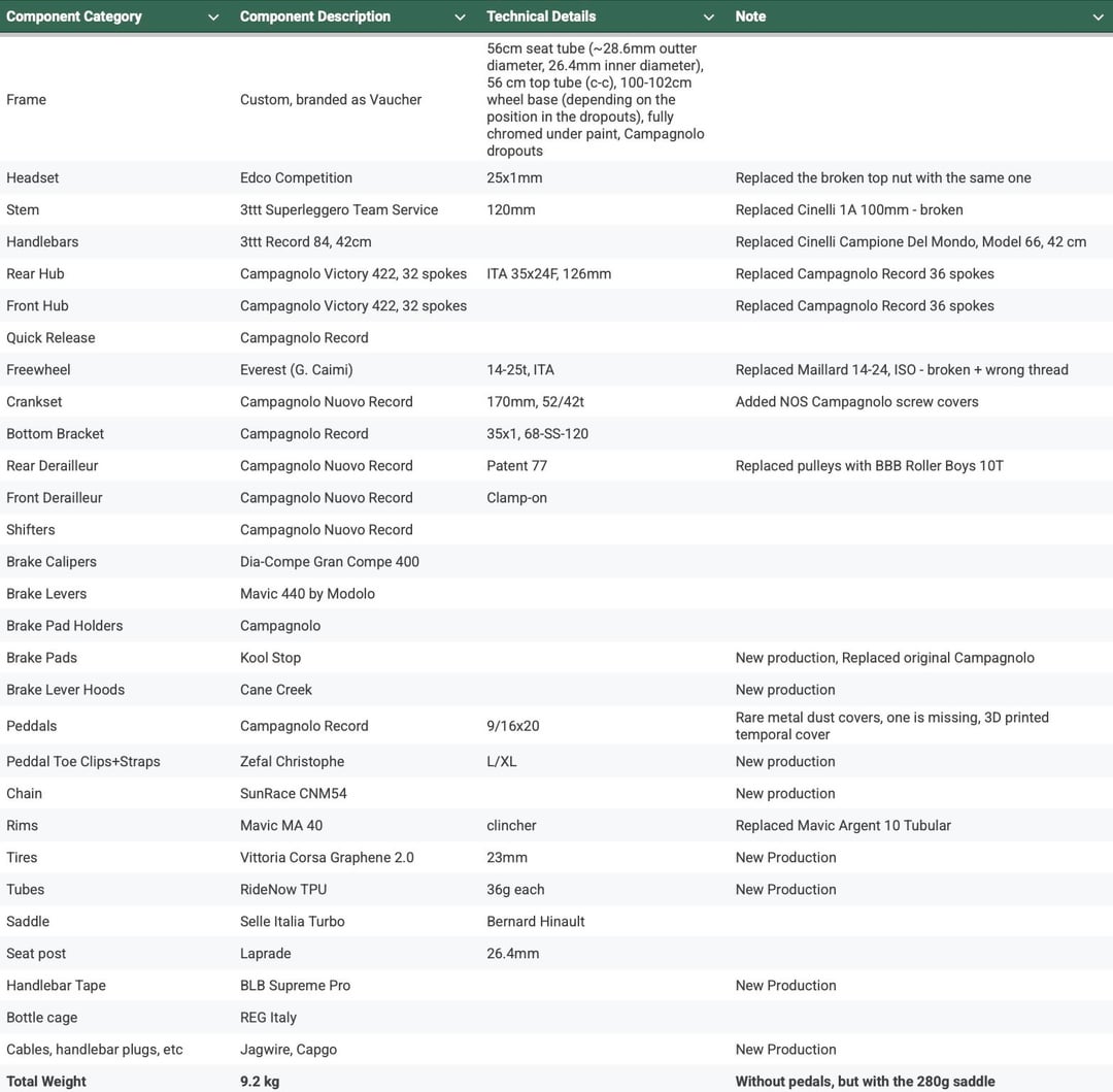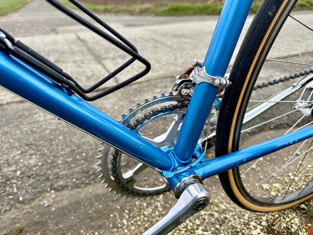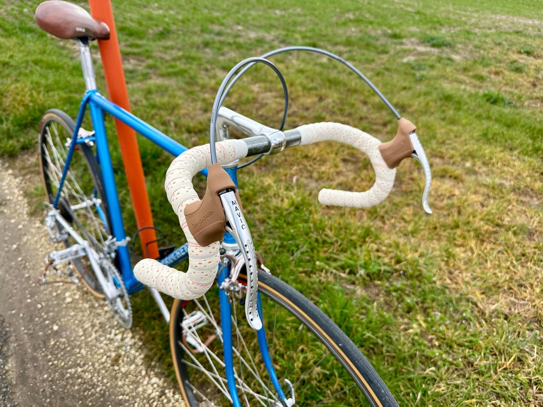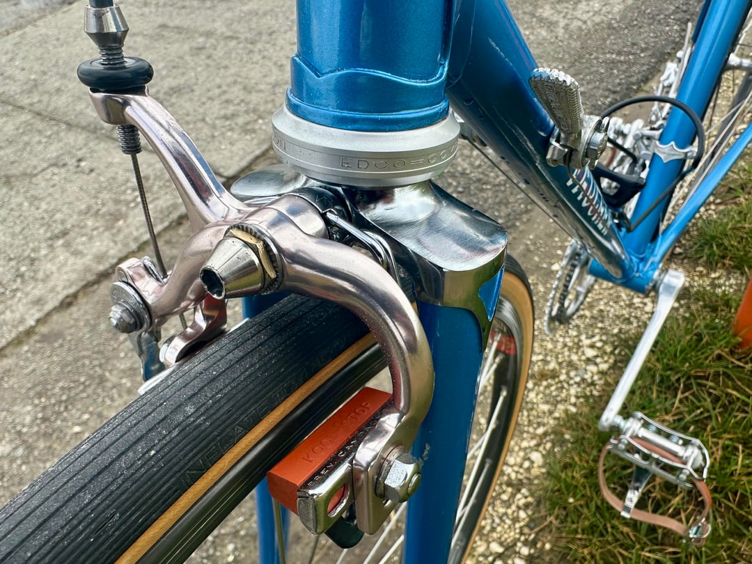 - The Wheels: The original tubular rims were in rough shape (the rear was badly dented). I made a decision to switch to clinchers for practicality, and managed to source a beautiful set of Mavic rims laced to Campagnolo Victory hubs.
