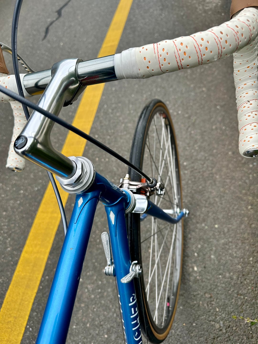 - The Stem & Bars: The original Cinelli stem had deep grooves from galvanic corrosion and was unsafe. I couldn't find an exact Cinelli replacement in the length I wanted, so I went with a near-NOS 3ttt stem and matching bars.