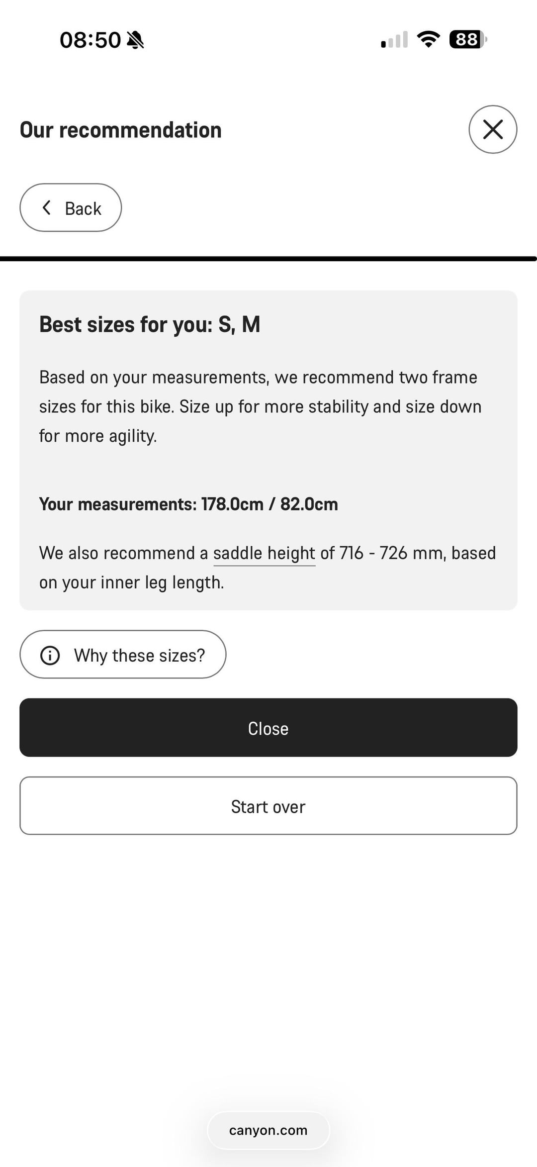 Looking to buy my first Canyon Aeroad soon but I’m right on the line between sizes S and M. I’m 178cm tall with an 82cm inseam and the chart said I can take both sizes depending on ride style: S for a racier position or M for longer rides and comfort. Just wondering if anyone has the same dimensions and what bike size they ended up getting?