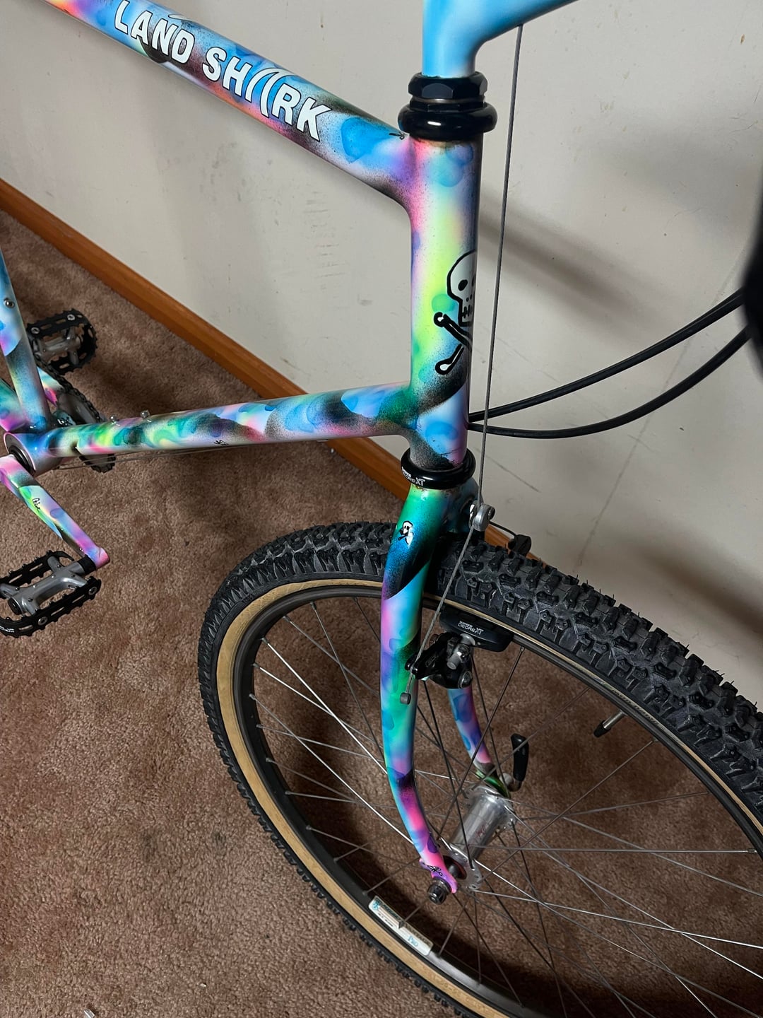 Full fillet brazing and crazy paint with 28 skulls. 1-1/4” headtube and 100/135 spacing. Full XT m732 with Phil wheels and rare Bullseye tandem cranks.