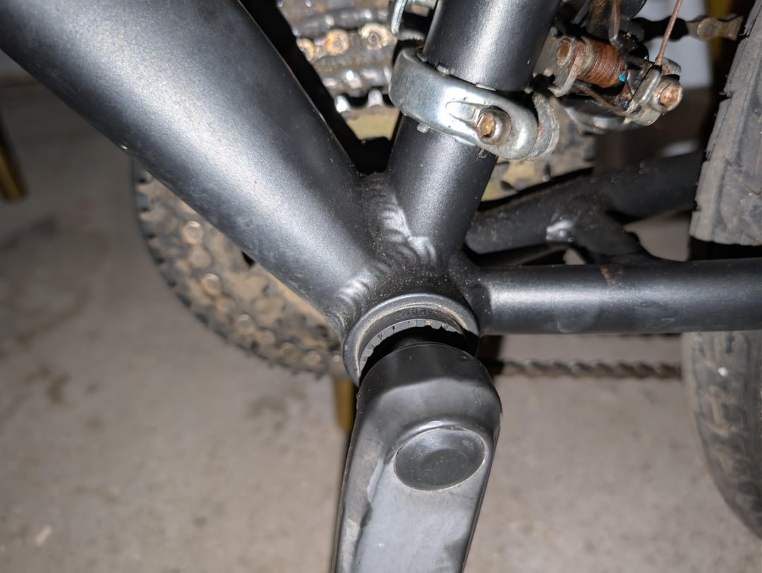 Du willst übrigens keine Mutter lösen, denn da ist keine, sondern das Tretlager ausbauen. Achte darauf dass die Lagerschale links ein Linksgewinde hat. Der schwarze Deckel auf der Kurbel ist nur ein gesteckter Staubschutz, den Du mit nem Taschenmesser abhebeln kannst.