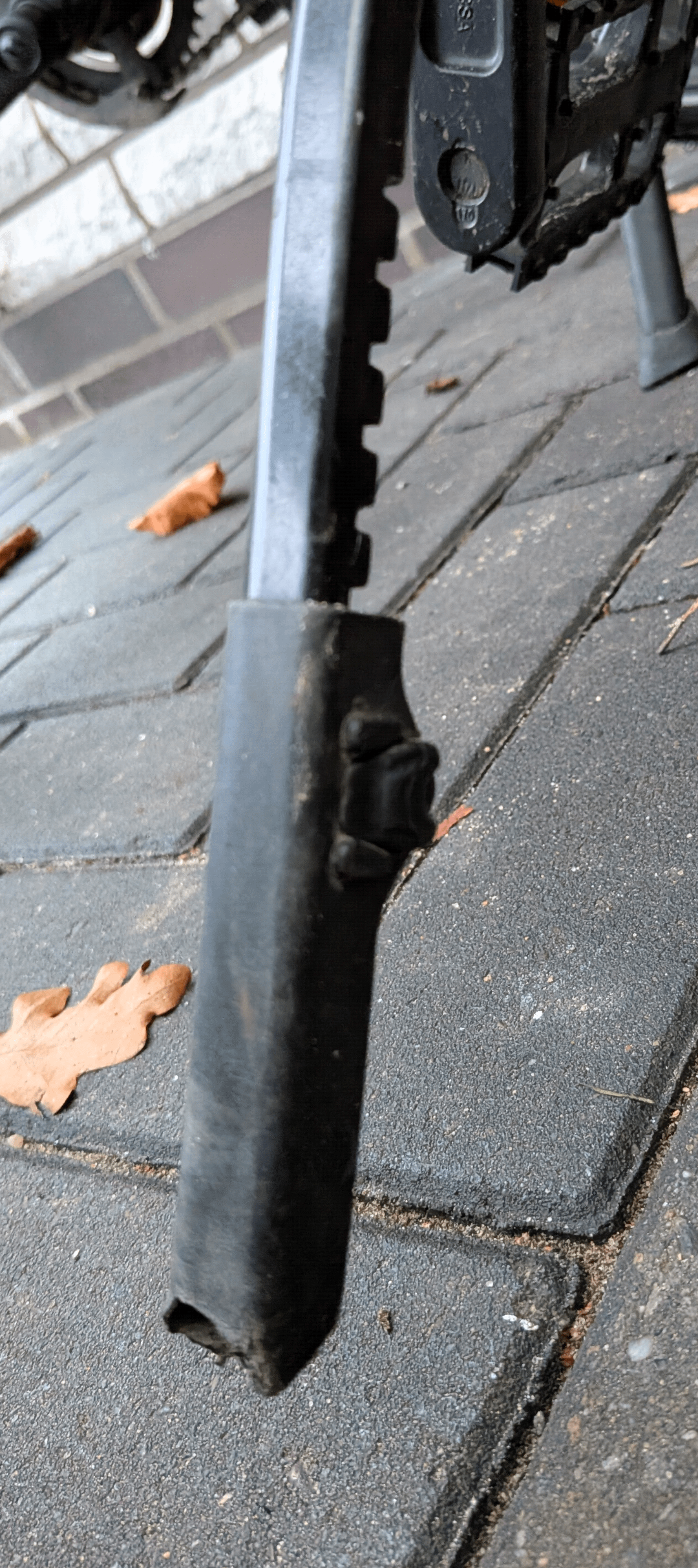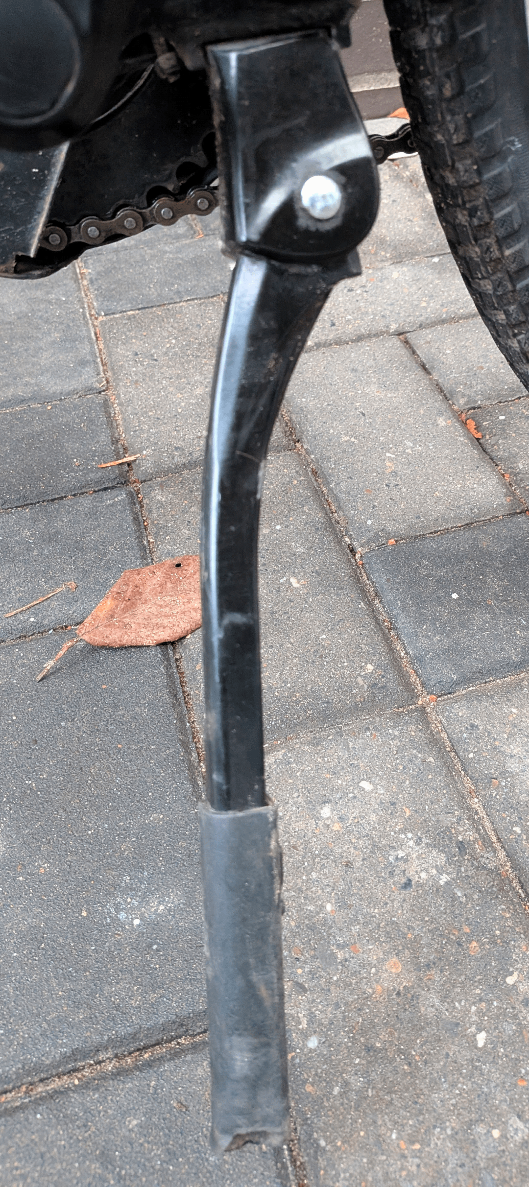 An Sohnemanns Fahrrad ist der Fuß vom Fahrradständer total verschlissen, deswegen steht das Fahrrad nicht mehr ordentlich und kippt insbesondere mit Gepäck (Schultasche) auf dem Gepäckträger-Korb ständig um.