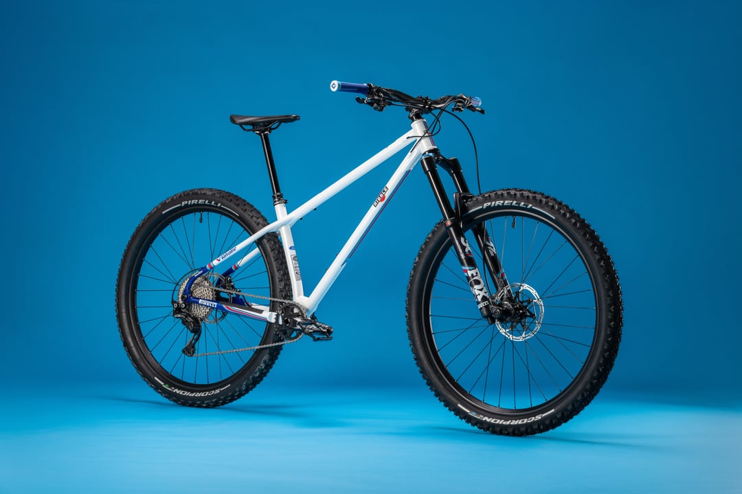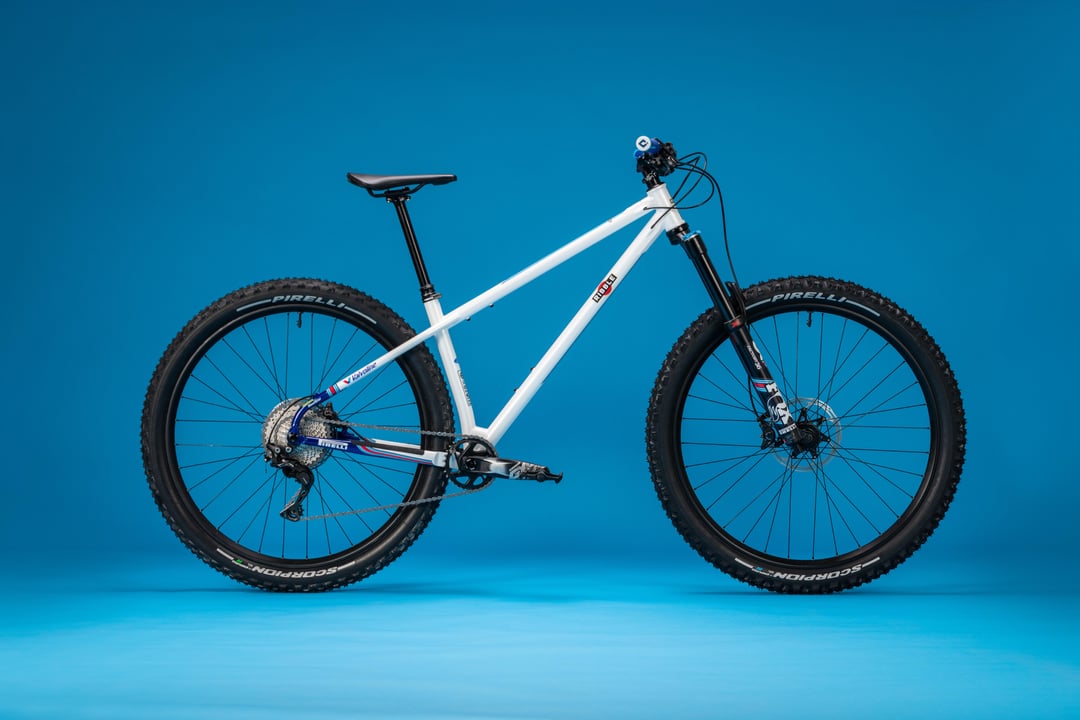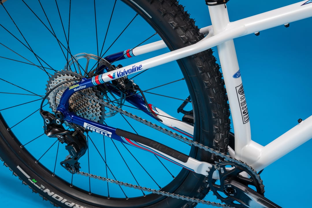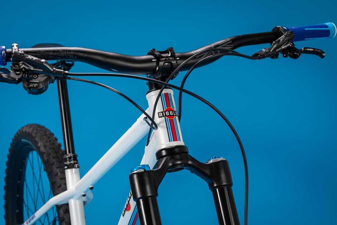I had a bare steel Ribble hardtail frame and box of spare parts to hand so spent a little while learning some basic illustrator skills and created the decals to use, then I painted the frame in white, with a little touch of Ford RS blue on the stays and started the build.