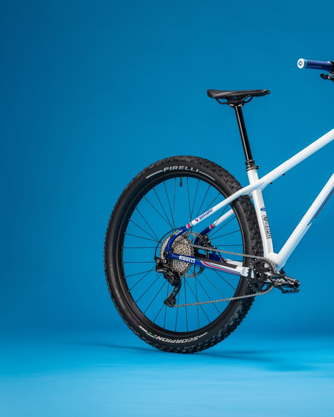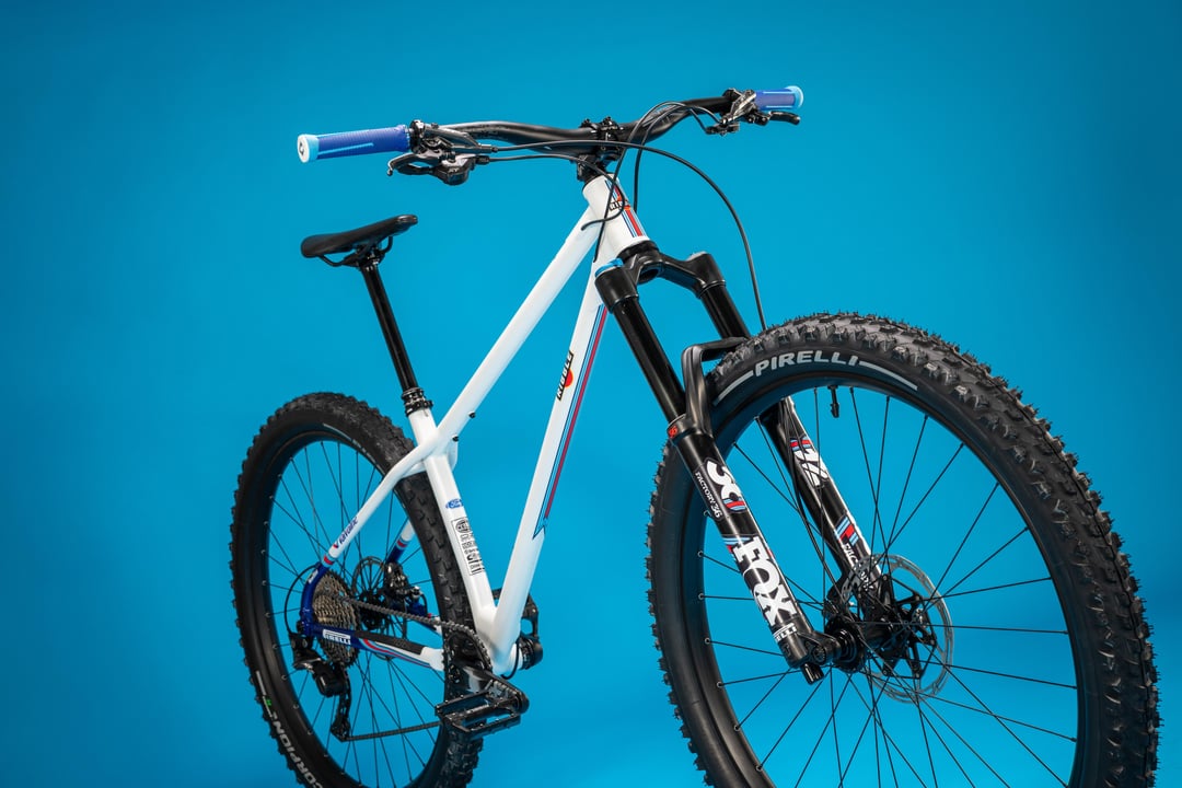 I had a bare steel Ribble hardtail frame and box of spare parts to hand so spent a little while learning some basic illustrator skills and created the decals to use, then I painted the frame in white, with a little touch of Ford RS blue on the stays and started the build.