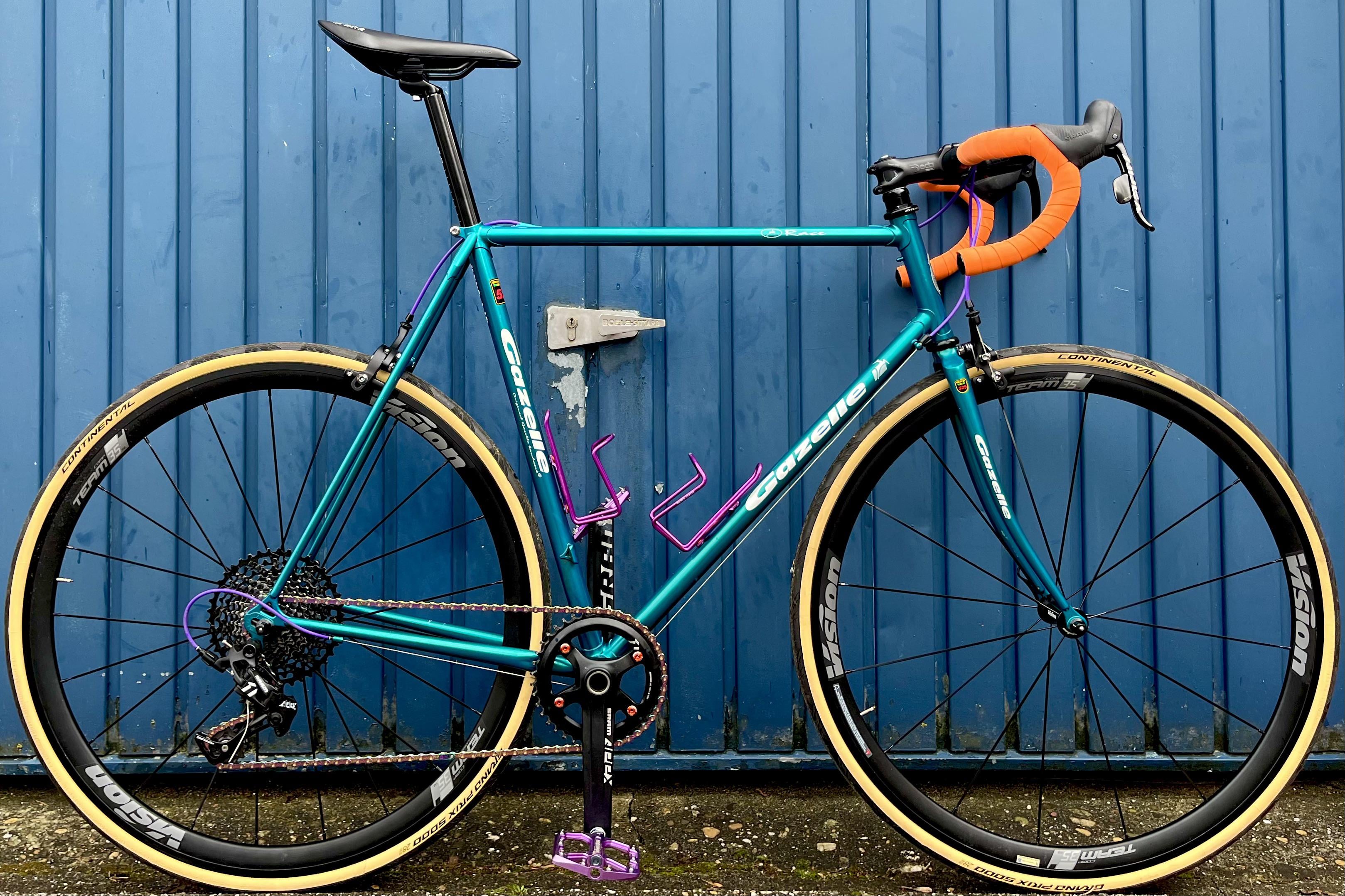 Built up an old 90s gazelle frame to serve as a neo retro commuter – training bike with mostly second hand parts. Swapped the original groupset for a mechanical SRAM Apex1 groupset (with campagnolo rim brakes). Added vision team 35 wheels and 28mm continental gp 5000 tyres. I did change the pedals for spd-al though. Saddle is a Fizik. Thoughts?