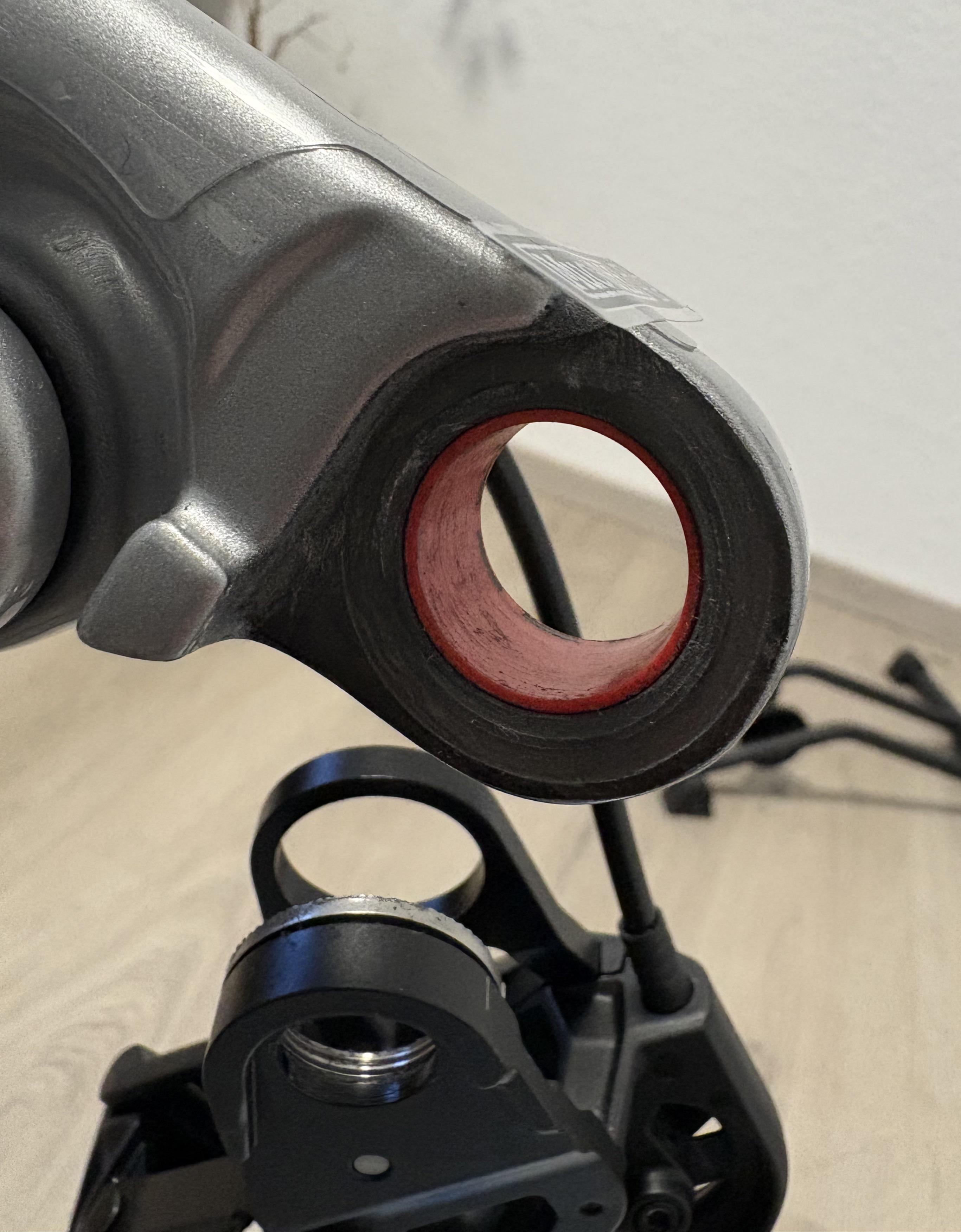 Dummheit bei der Montage eines SRAM Eagle 70 Schaltwerks am Neurad⌠Schaltwerk wird ohne Schaltauge direkt am Rahmen montiert wird und die Rändelschraube hat leider mitgedreh, da nicht gekontert. Die Innenseite der Hinterbauschwinge sieht nun so aus..