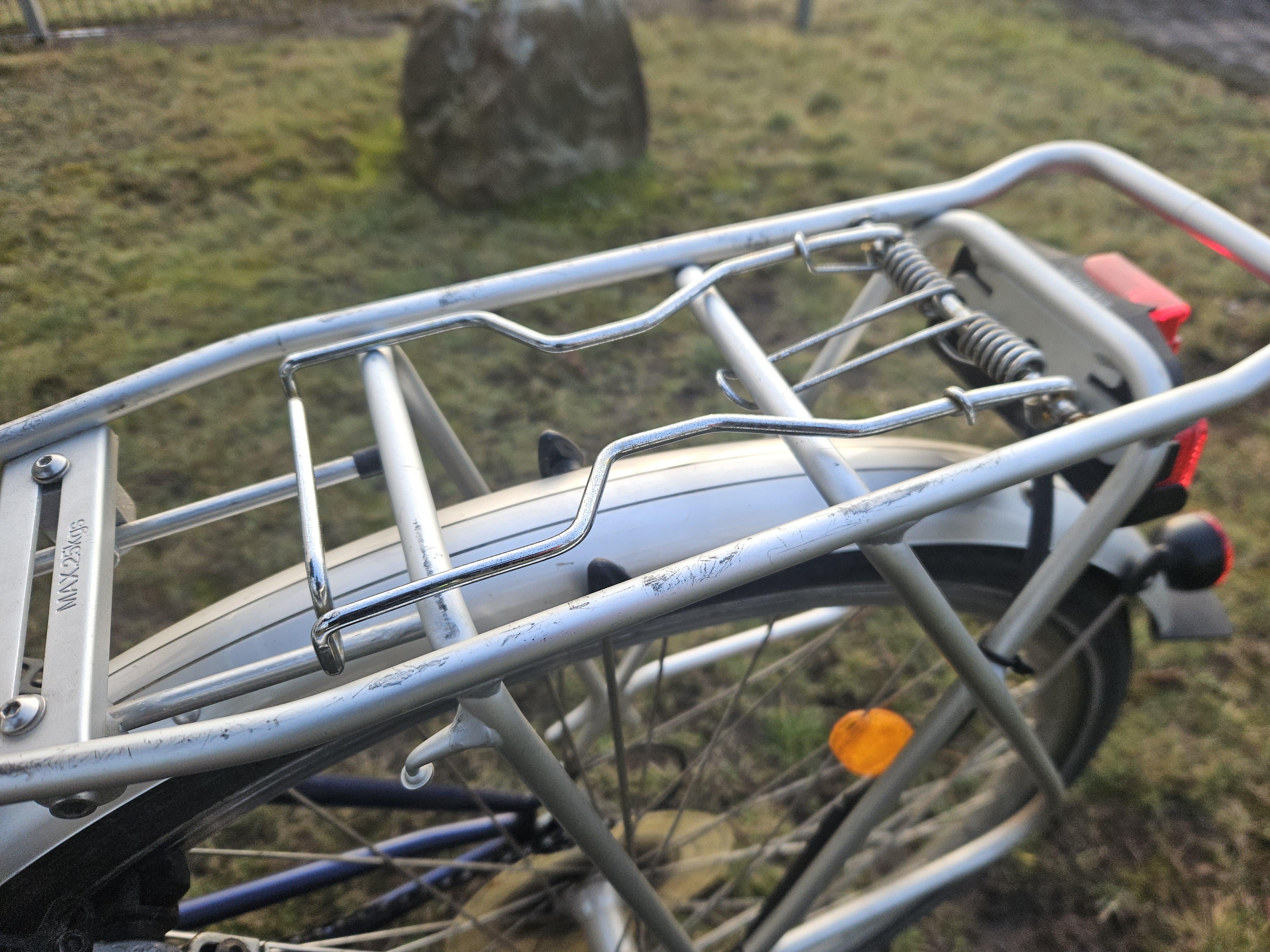 Der Gepäckträger meines Tandems klappert während der Fahrt. Die Federklappe scheint nach oben verbogen zu sein und schlägt dann bei der Fahrt auf den Gepäckträger darunter (siehe Lücke vorne links). Meine Zwischenlösung ist aktuell, eine Pappa dazwischenzuklemmen.