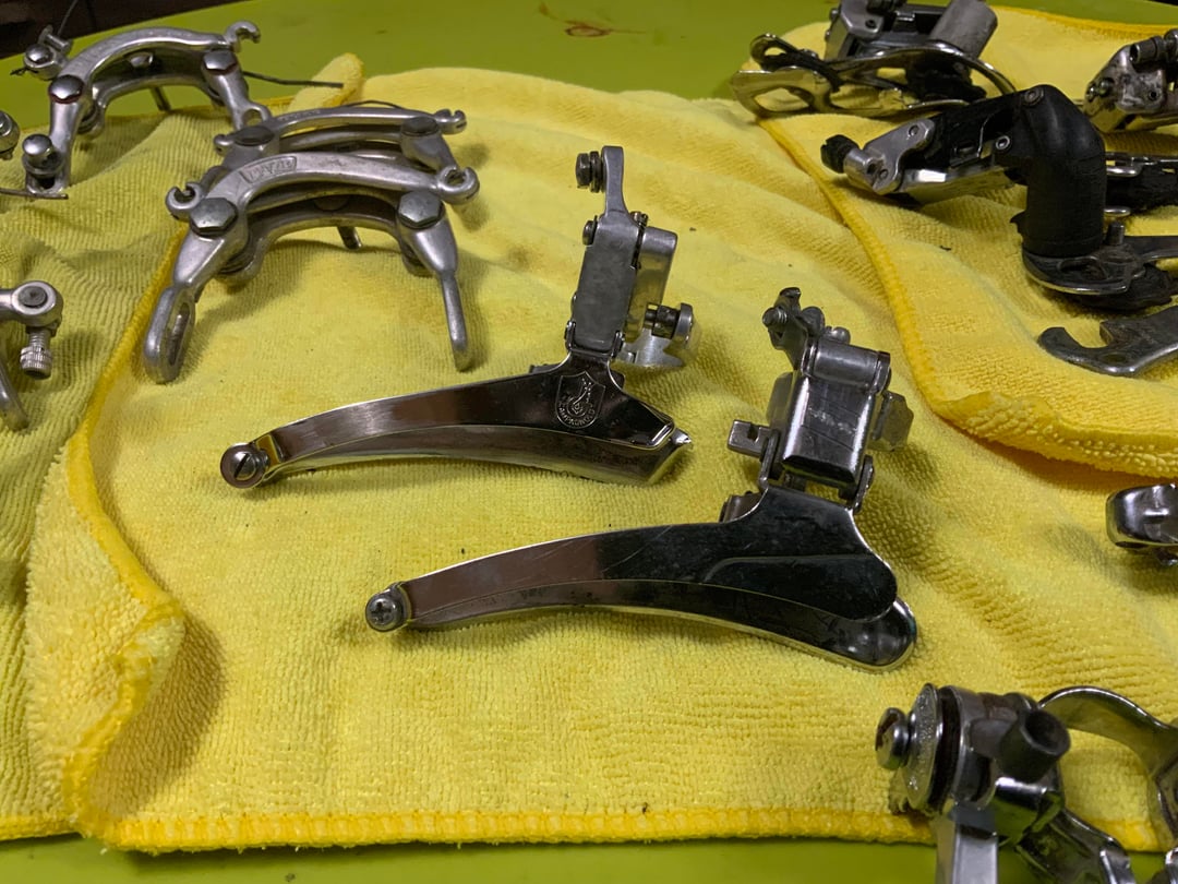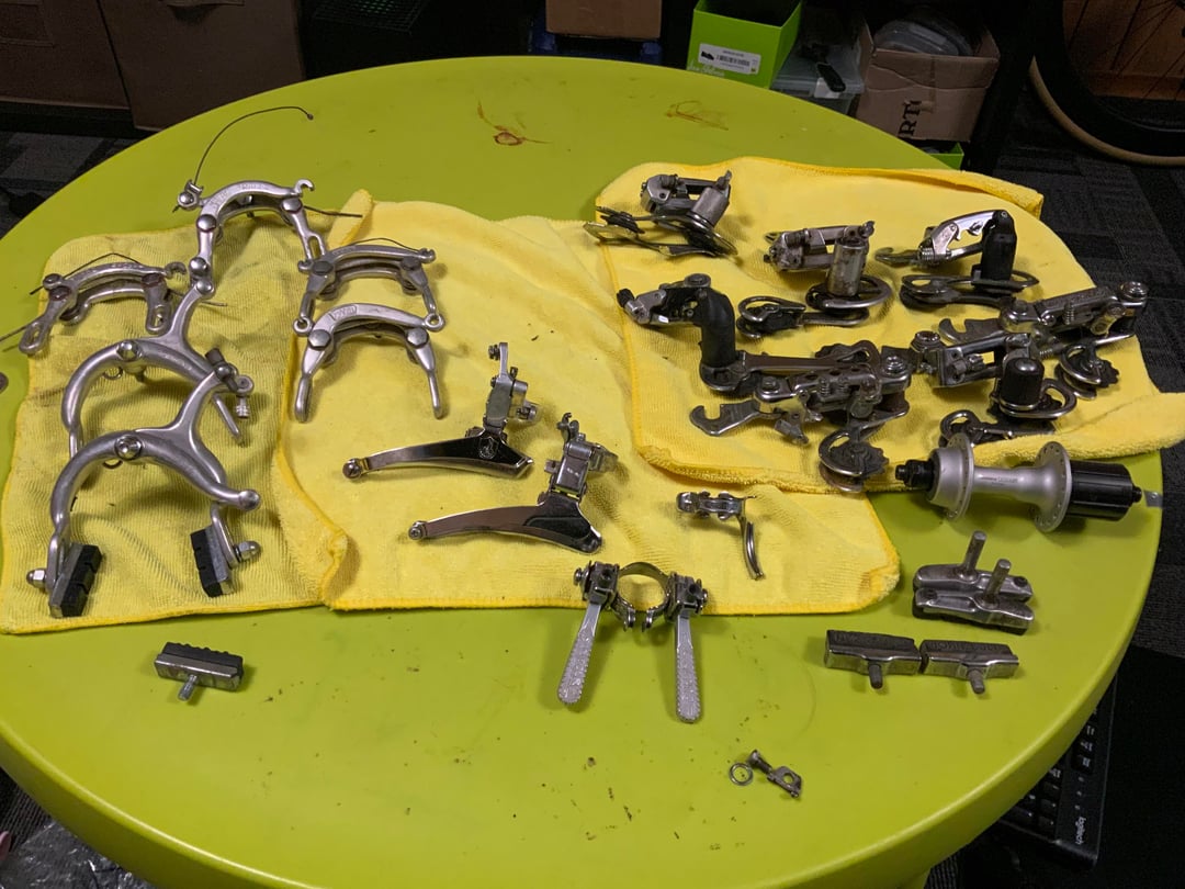 highlights are probably the Campagnolo front mech, Dura ace brakes and Suntour V-GTLuxe. Hopefully can clean these up and get them back on the road 🙂🙃