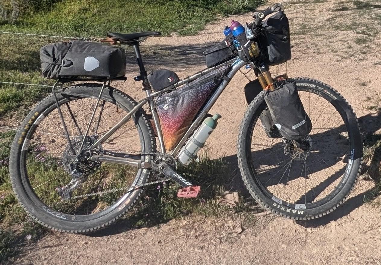I bikepacked the Queen's Ransom in Arizona 240 mile 17,000 ft of elevation gain in 5 days this week. I had my ortlieb pannier gravel packs on the sides but it was just too much for the technical trails. so I ditched a bunch of gear and while I was pondering how to attach one of the panniers I came up with this idea. it was solid and I am not kidding, it worked fantastic. I even got compliments. I was able to use my dropper post. The space was plenty enough for all of my sleep gear. Highly recommend.
