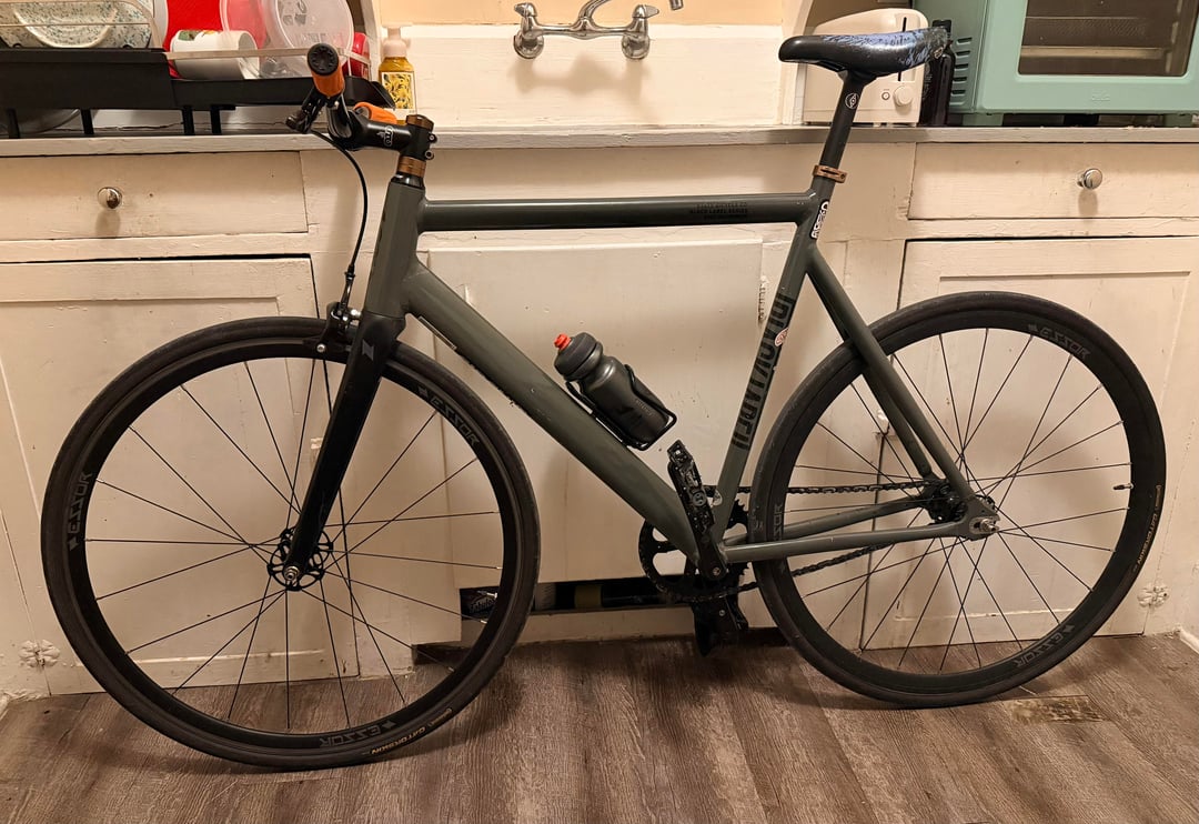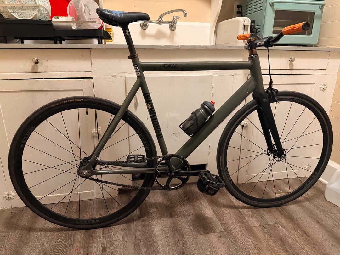 Don’t come @ me for the single strap I don’t ride fixed (respect to anyone that does, I just find it dangerous living in heavily populated areas). Believe it or not I bought her new and complete from Amazon in 2017 for 475 which is pretty wild. Recently got new wheels, brake cable, lever and grips. Love this damn thing so much, she’s an absolute shredder in the city.