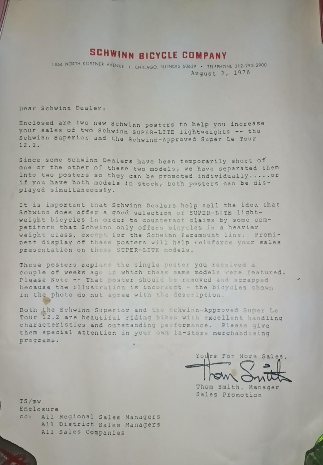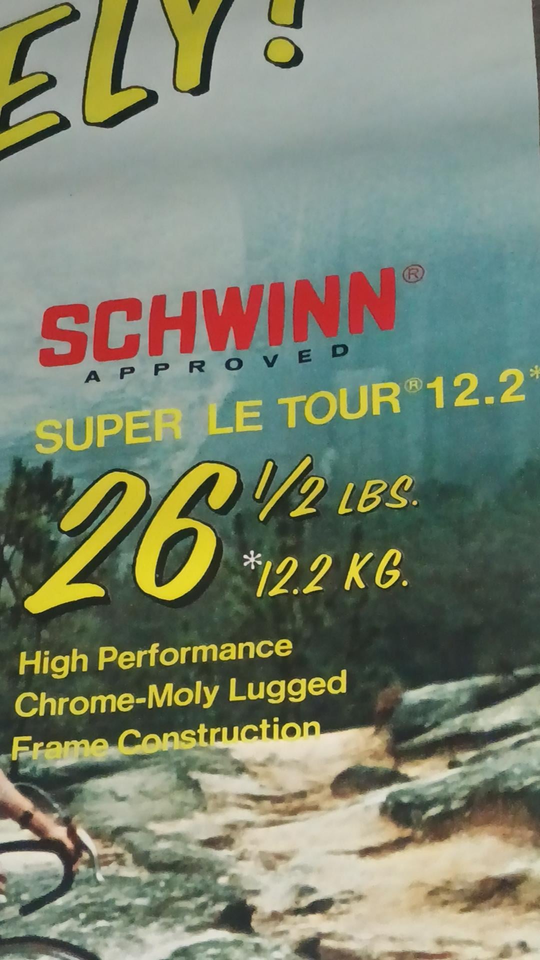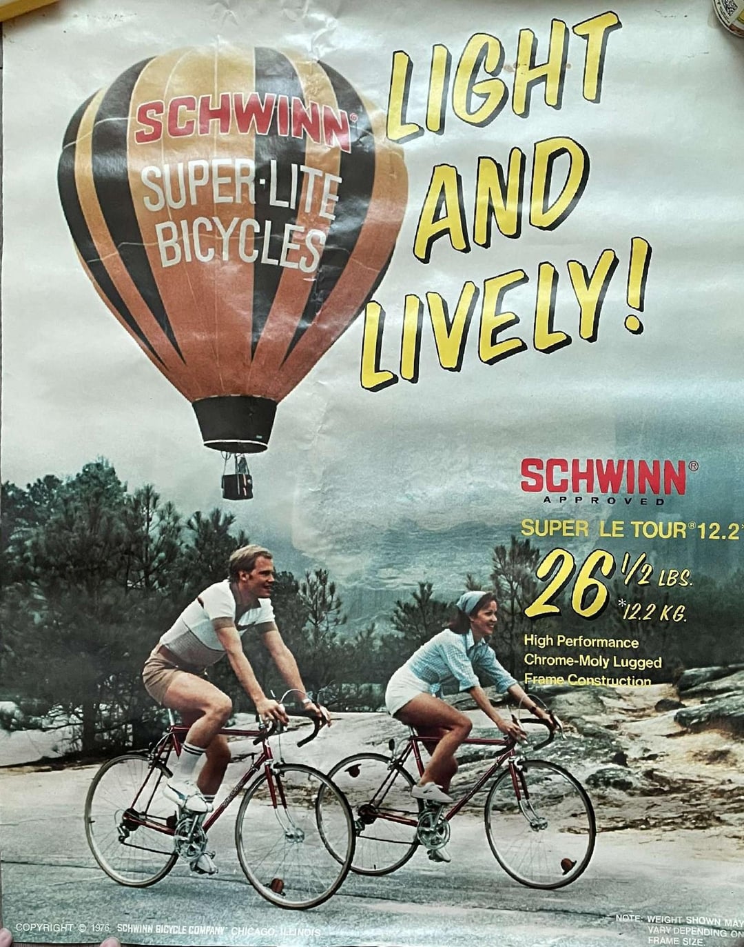 I believe I recently uncovered a rare, untouched Schwinn promotional poster that has remained stored for nearly 50 years. Upon close inspection, it becomes clear why this piece may have been pulled or remained unused: The bicycle featured isn’t actually a Schwinn Super Le Tour 12.2.