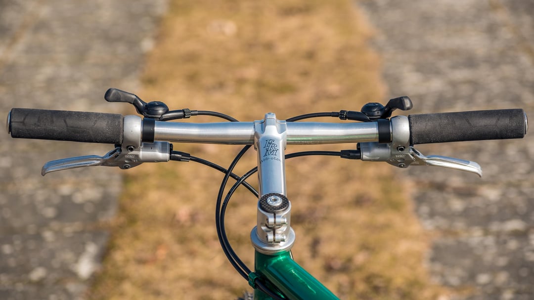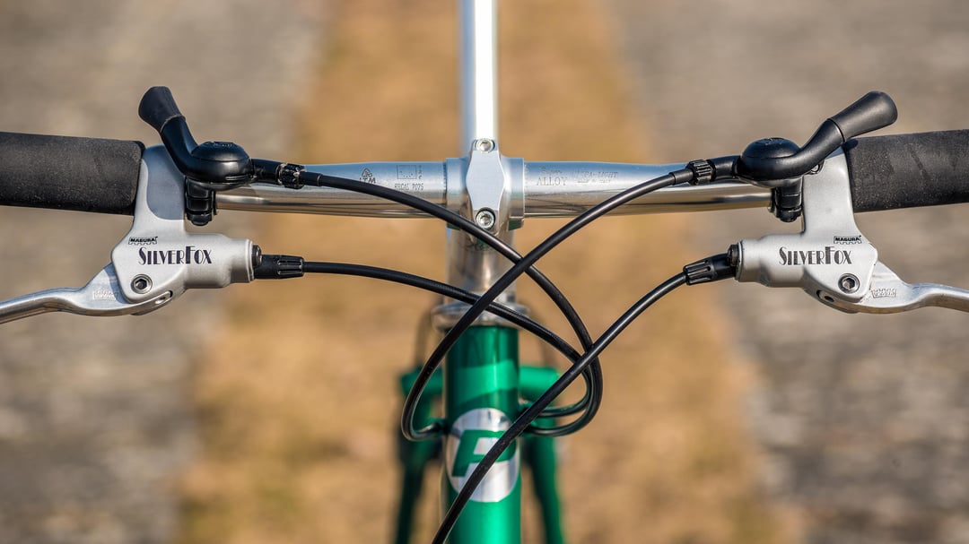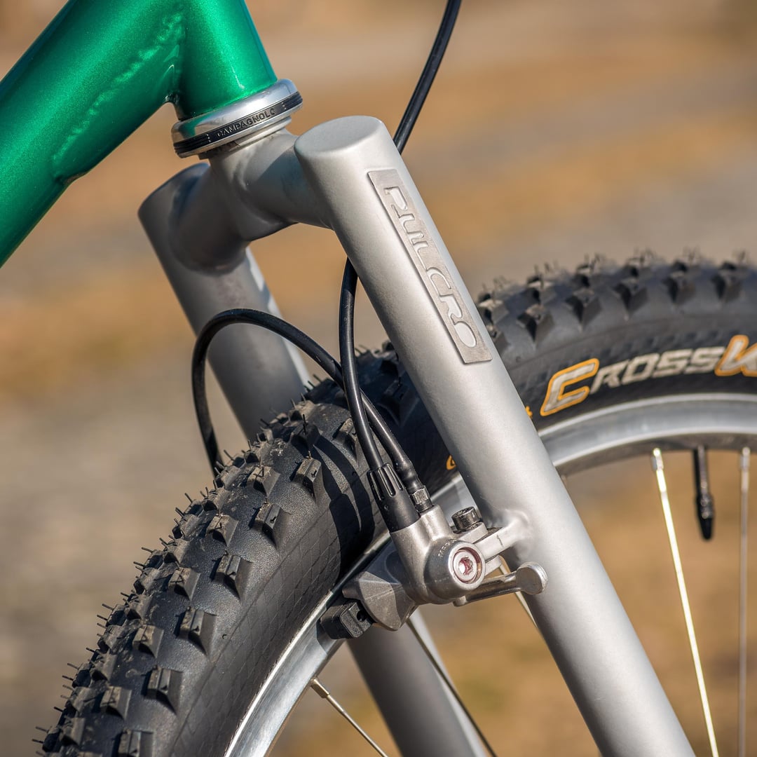 Brakes are Magura firm tech in front, HS33 with direct mounts in the back and matching HS33 "SilverFox" brake levers. Group is Campagnolo Record O.R. with thumb shifters, front and rear derailleur, headset, crank set, bottom bracket and hubs. Campagnolo Stheno rims and Olympus seatpost. Selle Italia Flite Titanium Kevlar saddle, Sapim spokes, Continental CrossKing tires, FRM stem, ITM bars, Tune grips and Elite bottle cage.