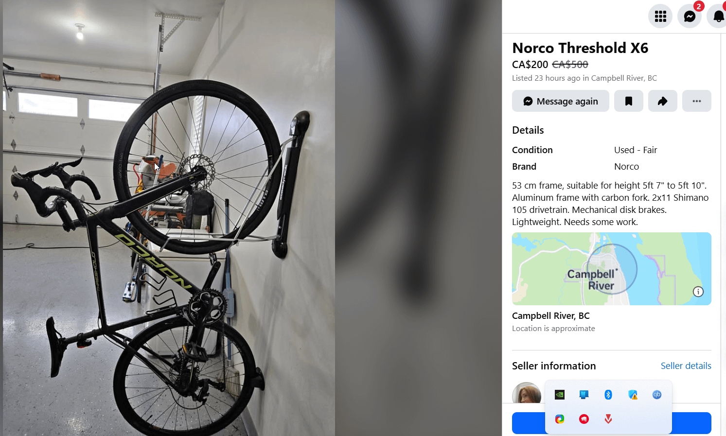 Seller seems to have lowered price because shifting isn't indexed properly, might need new brake pads etc. (easy fixes) Good deal? 105 groupset, mechanical disc brakes. by OrneryLocal1900 Bicycle Bike Right for me Which bicycle Which bicycle is right for me Which bike Which bike is right for me