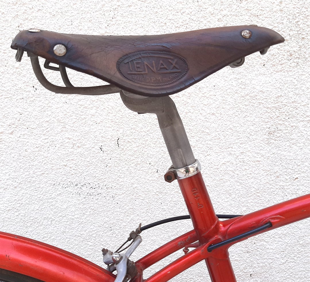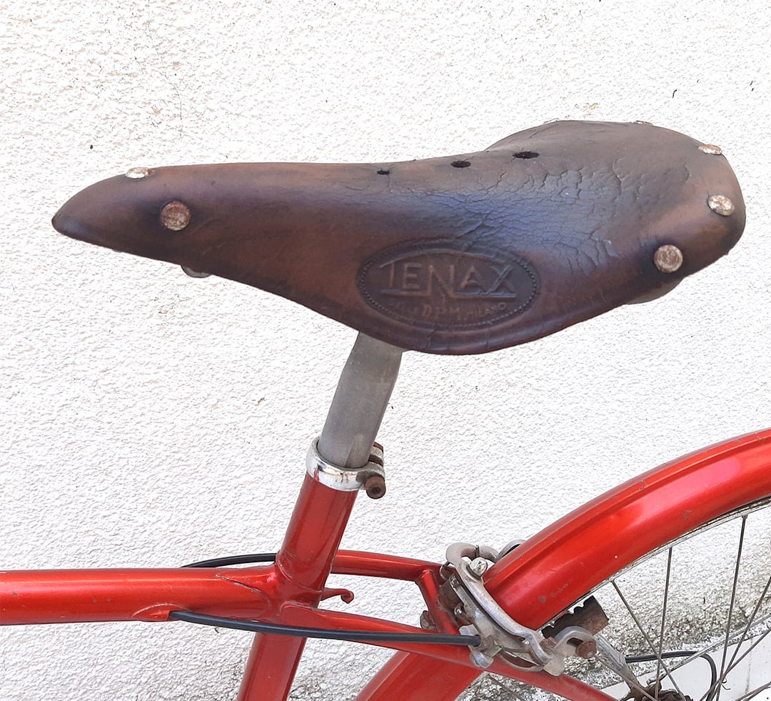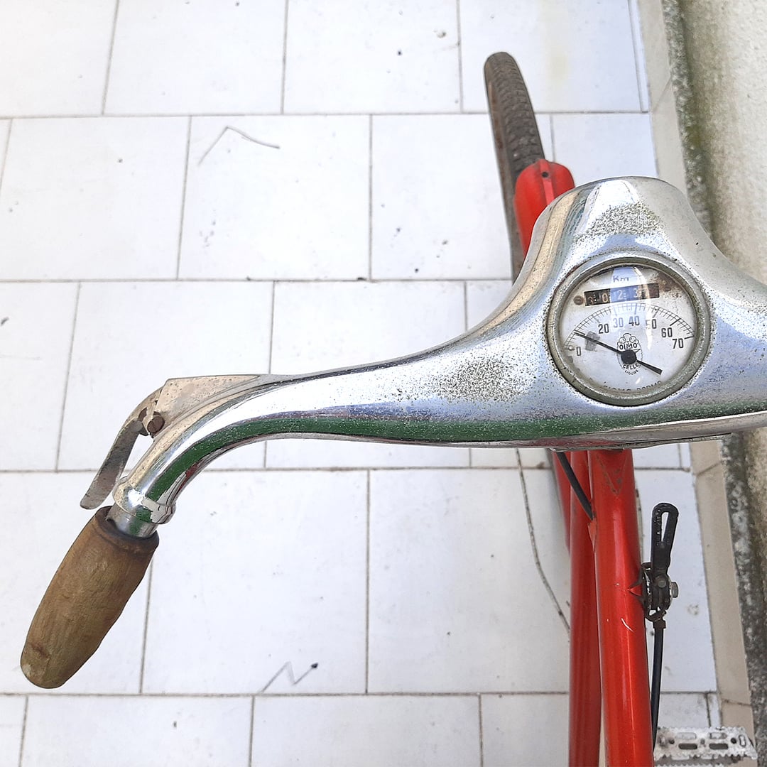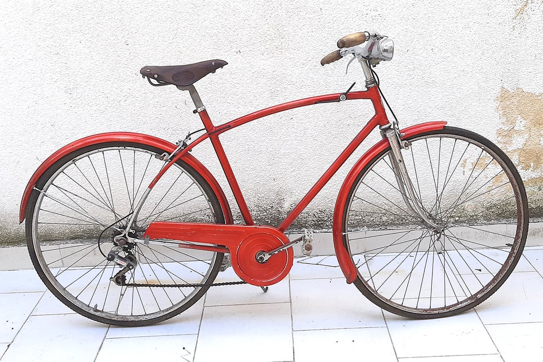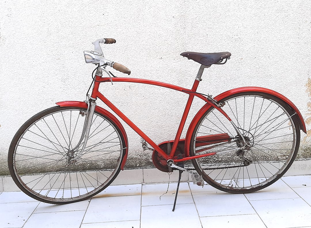 One of the most curious bikes is this Olmo Di Milano bicimotore from around 1955, I believe. This one doesn't have the engine, gas tank, or connections. I guess one of the previous owners before my father must have decided to turn it into a regular bicycle for some reason—maybe the engine broke down and there was no replacement, or they just wanted a regular bicycle. It has a large front headlight, but it doesn't appear in the photos—I have it stored somewhere and need to reattach it. I think that one is also either powered by fuel or by a dynamo, but I'm not sure. The serial number appears to be D 110 (see last picture).