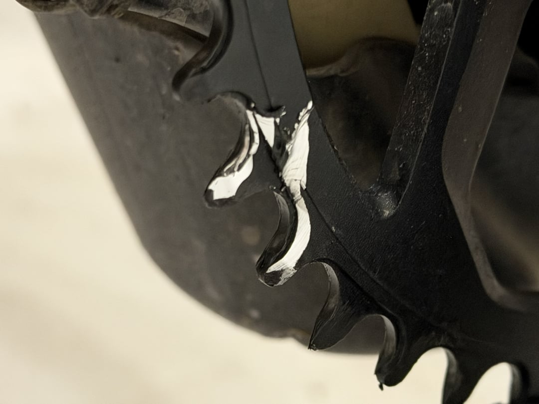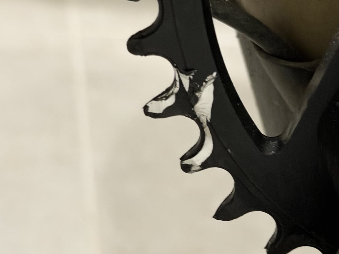 Darauf ist mir ein Schaden am vorderen Kettenblatt aufgefallen, siehe Fotos. Kann dieser Schaden durch das defekte Kettenglied entstanden sein? Ist das jetzt defekte Kettenblatt ursächlich für die rausspringende Kette?