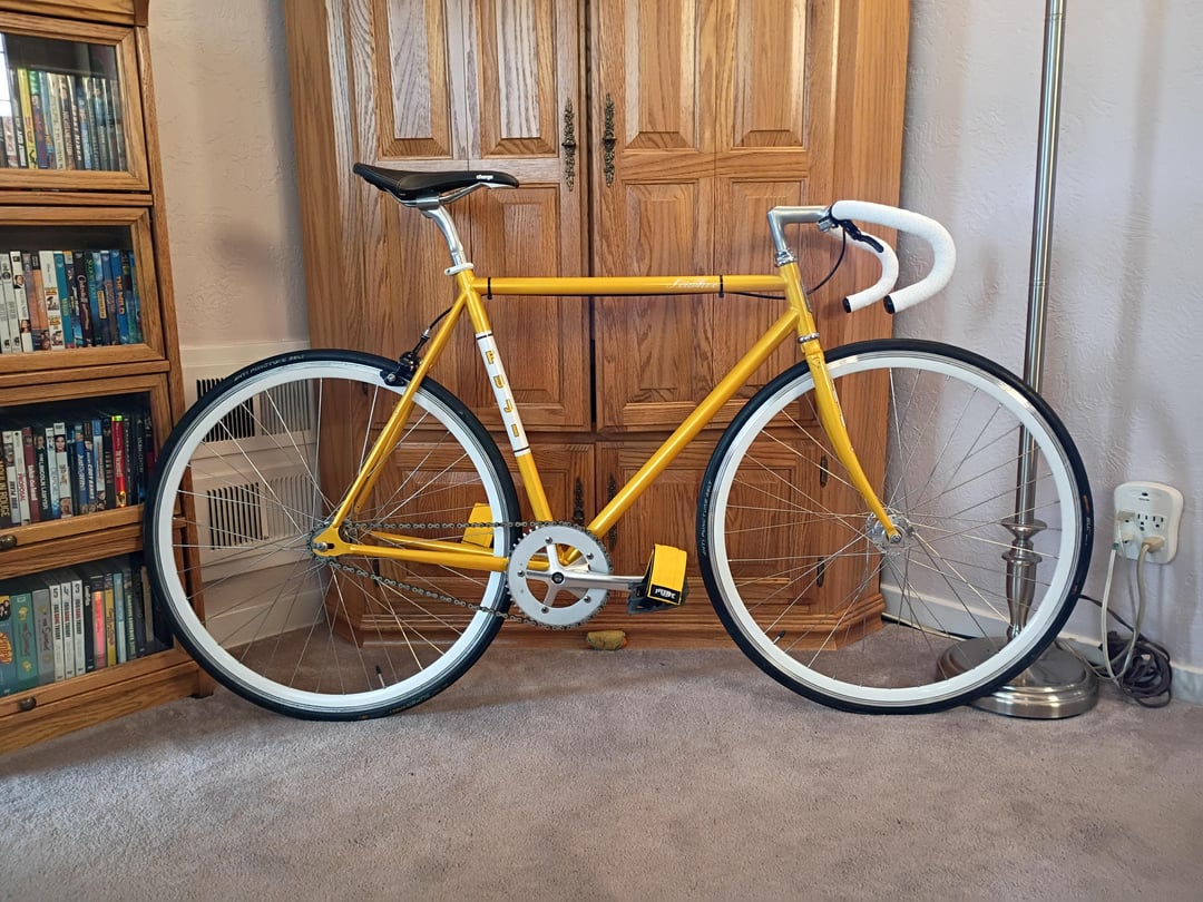 Just picked up this 2010 Fuji feather for $100. Put a new charge sadle, petal straps and bar tape for another $60. Bike is almost brand new. by Necessary-Ebb-8752 Bicycle Bike Fixed Gear Fixed Gear Bicycle Fixed Gear Bike