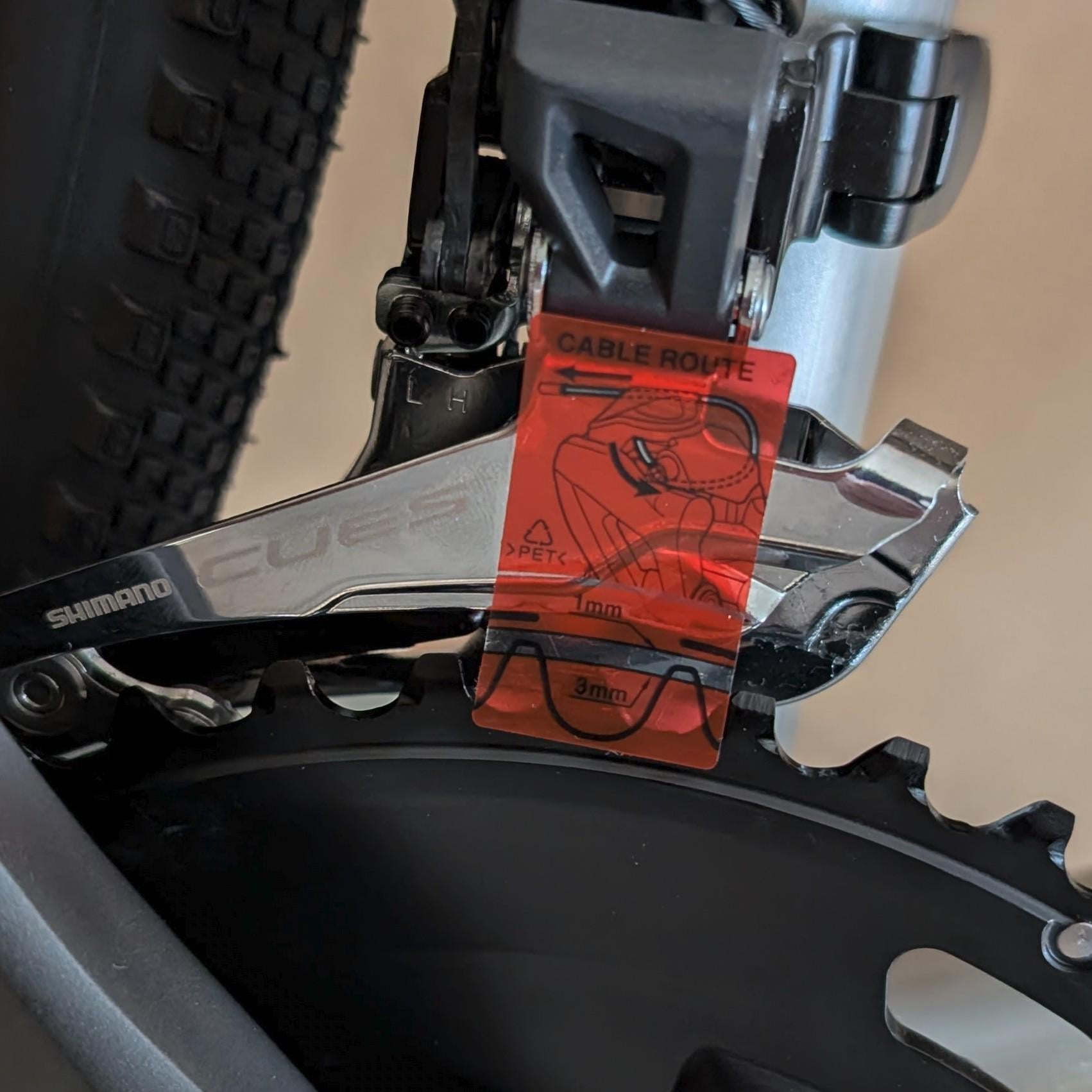 mein Canyon Endurace Allroad ist heute angekommen und nach dem Zusammenbau hab ich Zweifel ob die Schaltung OK ist. Erst einmal ist da dieser Sticker auf dem Bild mit diesem transparenten Toleranzbereich (?), laut KI sollte die Unterkante des Umwerfers an der oberen Linie verlaufen, was es nicht tut. Ist das korrekt?