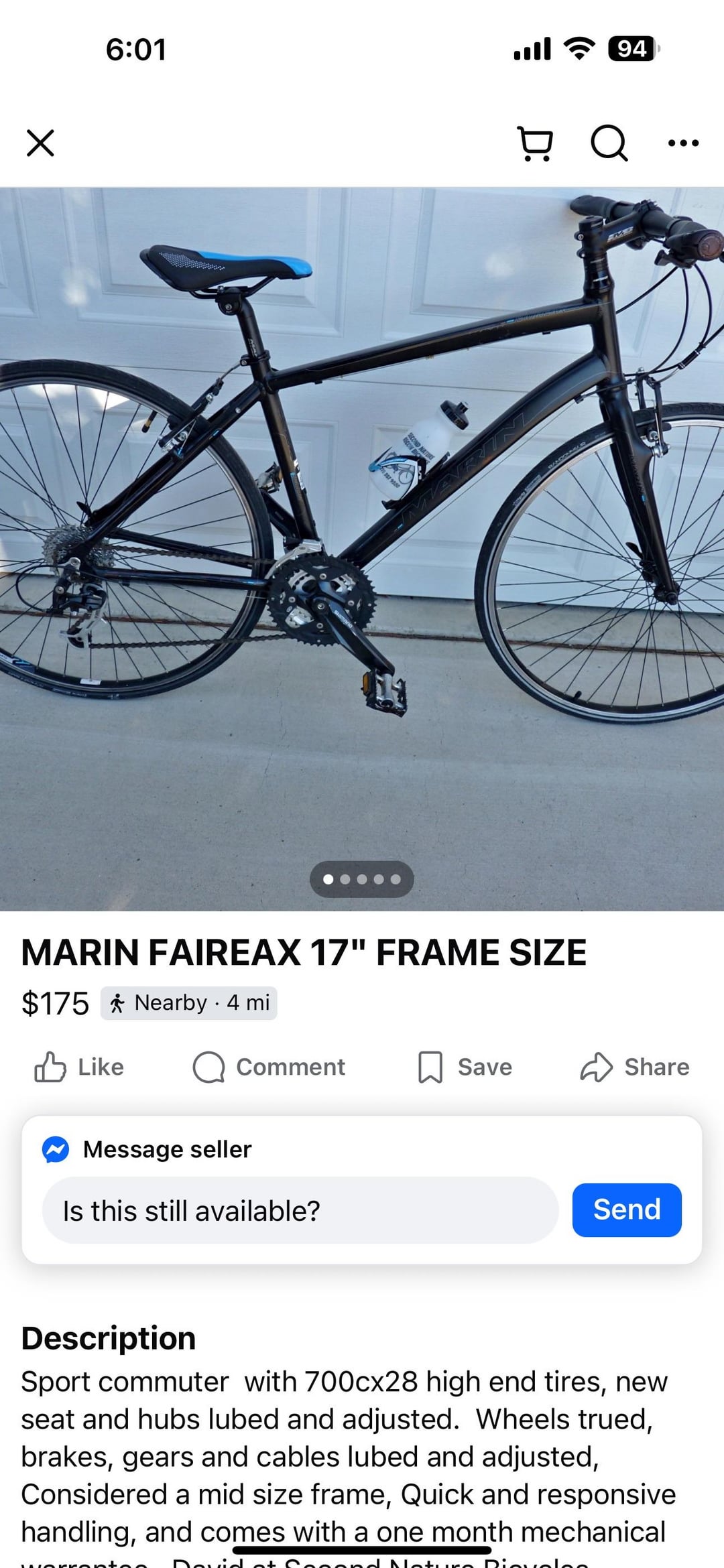 Looks like there’s a guy on Facebook marketplace that rebuilds bikes and his reviews are amazing. He’s selling this with his own 30 day mechanical warranty. I know I have to go take it for a test ride to see if it’s really a good fit but I’m 5‘10“ tall not sure if 17 inch frame is a good place to start? I messaged him to see if I could put larger tires with more of a gravel style knobs on it and if I could put racks on it for some grocery getting. Thank you