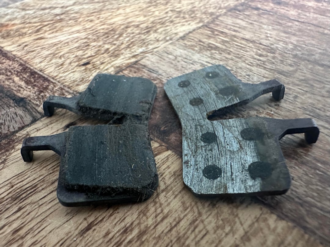 Erhöhter Verschleiß bedeutet hier: Der Sinterbelag war komplett runter, siehe Foto. Interssanterweise nur auf der einen Seite.