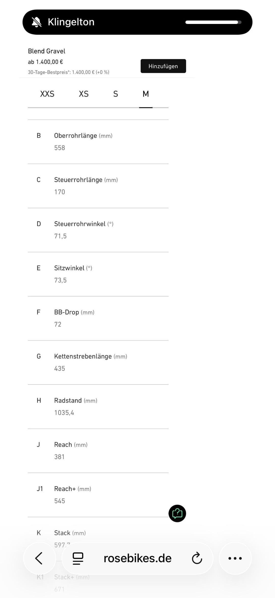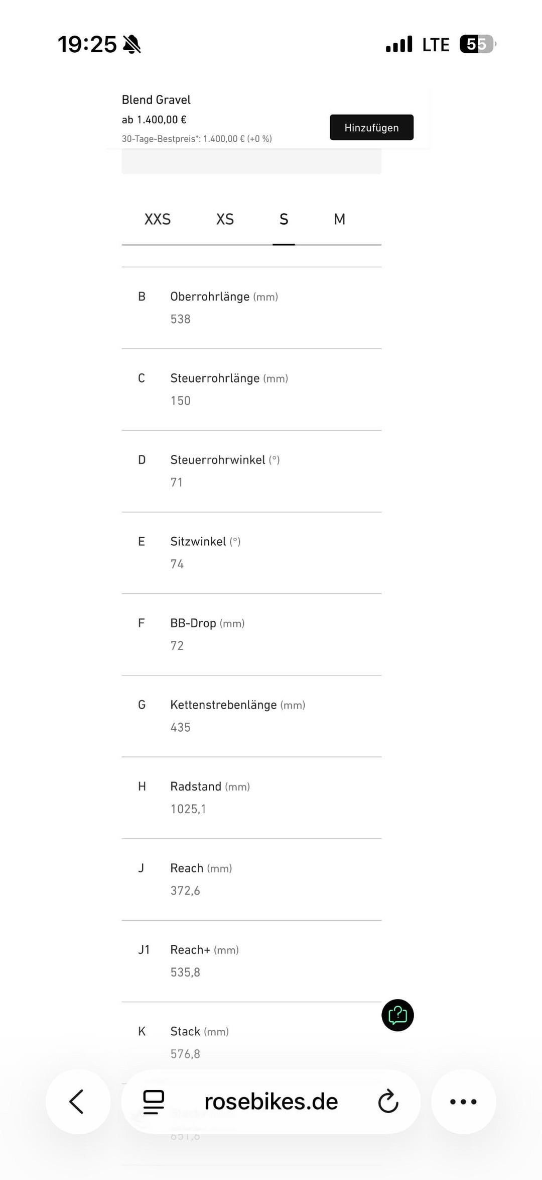 Hi! Ich möchte mir das Rose Blend Gravel zulegen, bin mir aber unsicher, ob ich Größe S oder M nehmen soll. Ich bin 177 cm groß, Schrittlänge 81 cm (entspricht der Rahmengröße 53,5 cm). Da würde ich eigentlich in den oberen S Bereich laut Herstellerangabe fallen. Die Lieferzeit ist aber mit 7 Wochen sehr lang und wenn ich Größe M nehmen würde, nur 7 Tage. Ich habe leider auch nicht die Möglichkeit einer Probefahrt, da ich zu weit weg vom Store wohne. Macht es wirklich einen großen Unterschied ob ich S oder M nehme? Auch im Hinblick darauf, dass ich eher eine aufrechtere/komfortablere Sitzhaltung bevorzugen würde. Anbei die Abmessungen. Danke schon im Vorhinein!