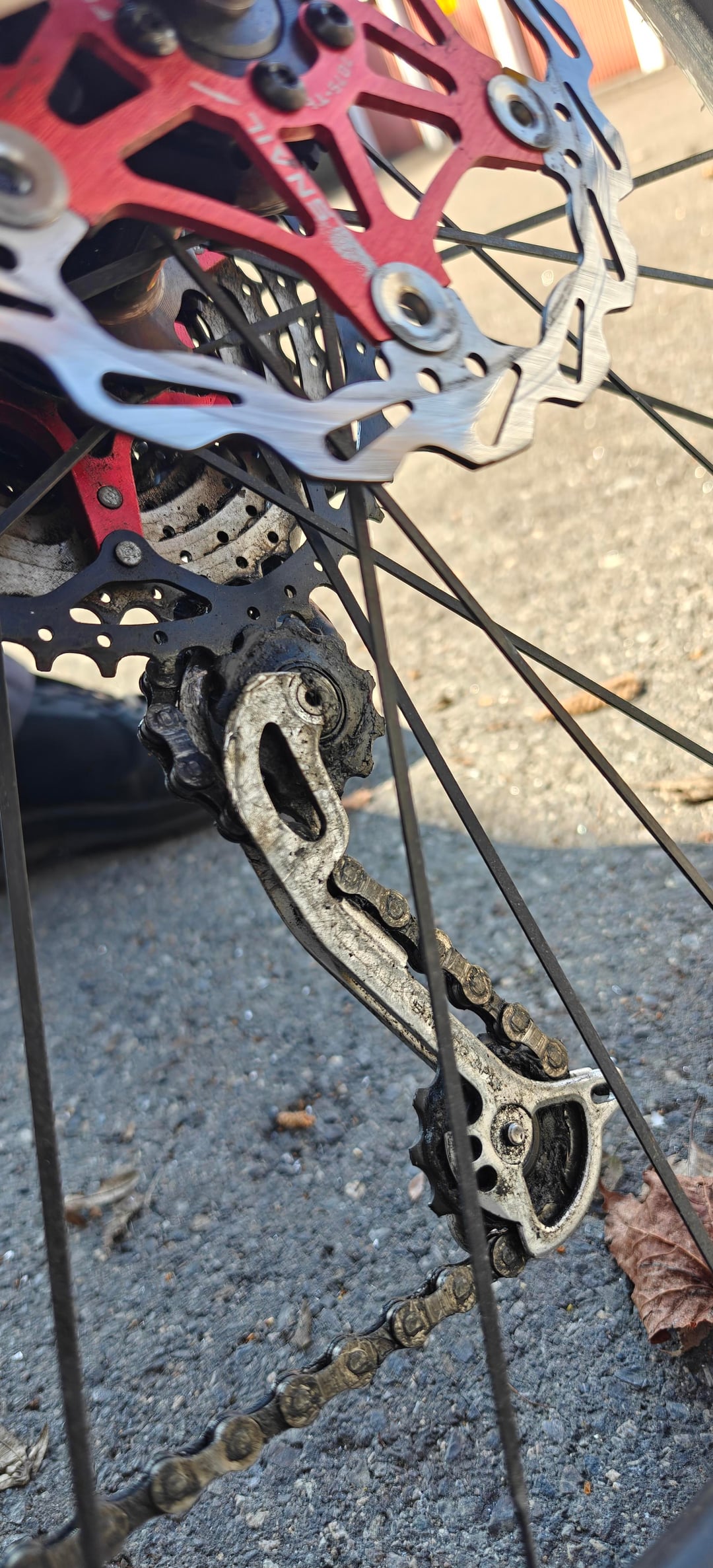 1.Problem: Wenn ich auf das größte Ritzel hinten schalte springt das kleine Zahnrad hinter das Ritzel und lässt sich nicht mehr schalten sondern nur von Hand wieder vor drücken.