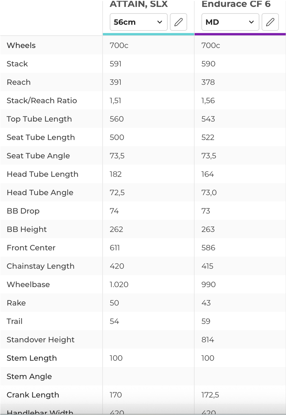 I ride on asphalt about 90% of the time, some of it is on bad quality asphalt, fairly flat area with some hills, occasionally gravel roads. The Canyon takes 35mm tyres, the Attain only 32s, however I've heard it can take 35mm too (which would be my preference, that's what I have currently), not sure if it's a huge difference in case it can't. I'd prefer a more 'sporty' geometry, but I think they're about the same, as far as I can tell from the numbers – I could be wrong though, so I included the geometry table.