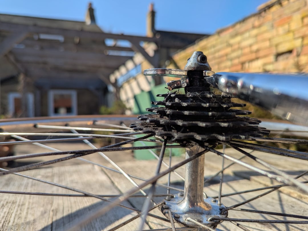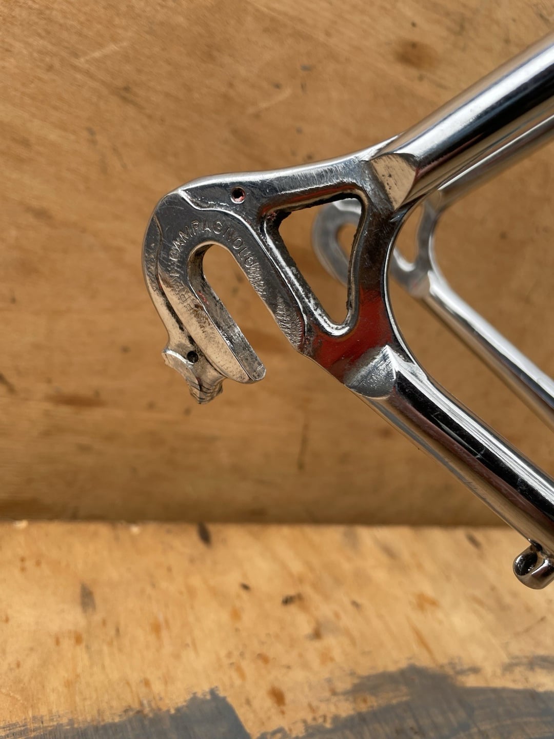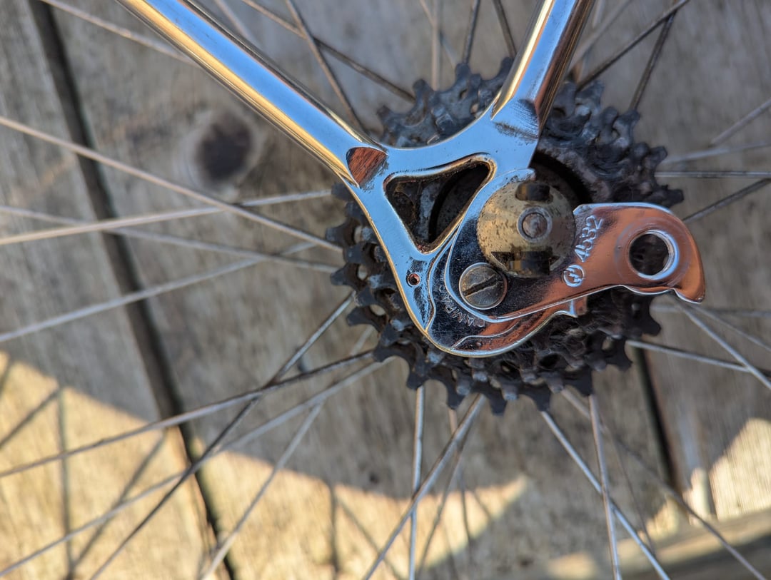 I only realised later though that it appears the dropouts are Campagnolo 1010/b 'short' dropouts, which means with the derailleur claw attached the wheel ends up clamping very far forward in the dropout (see pictures).