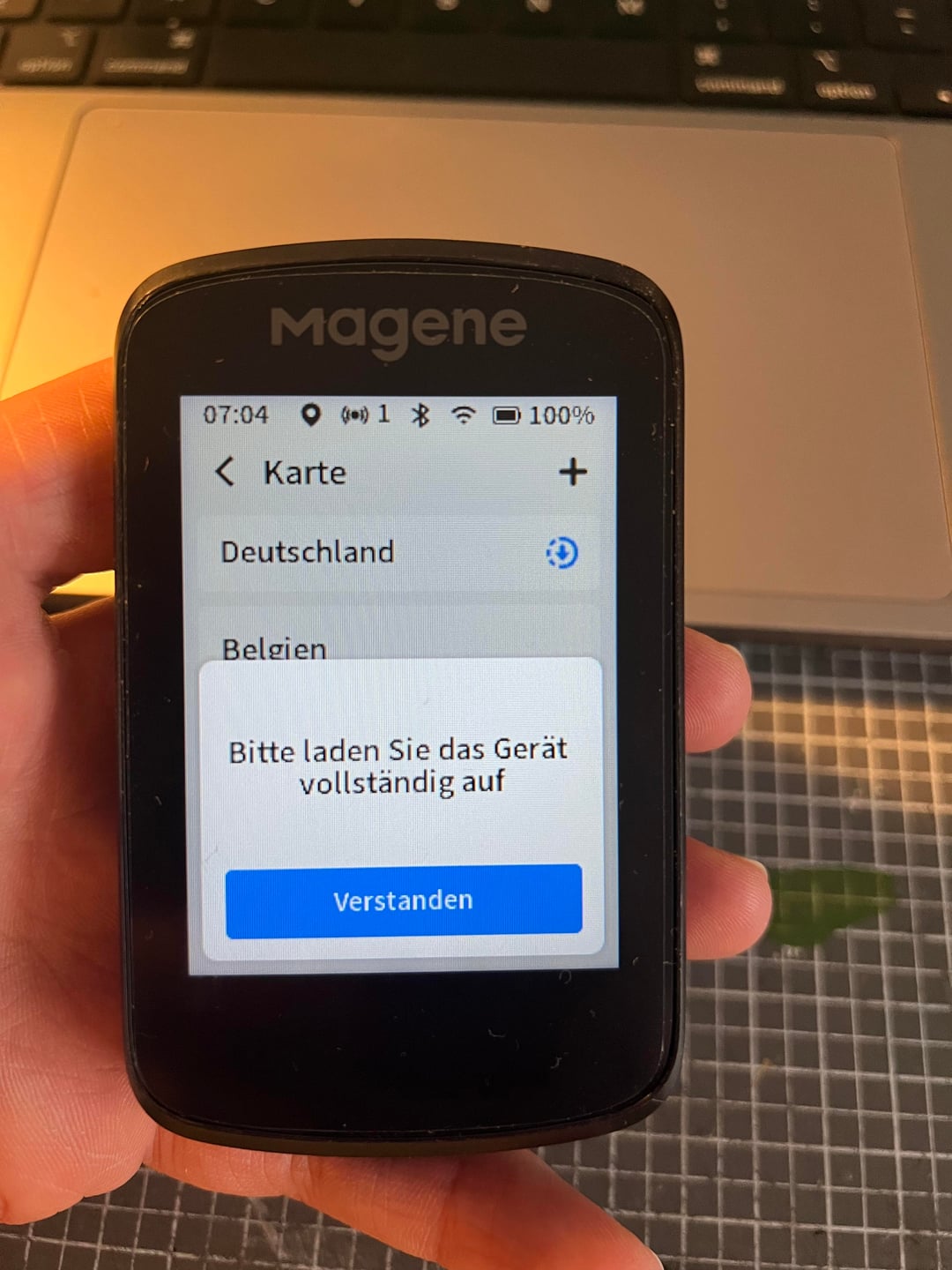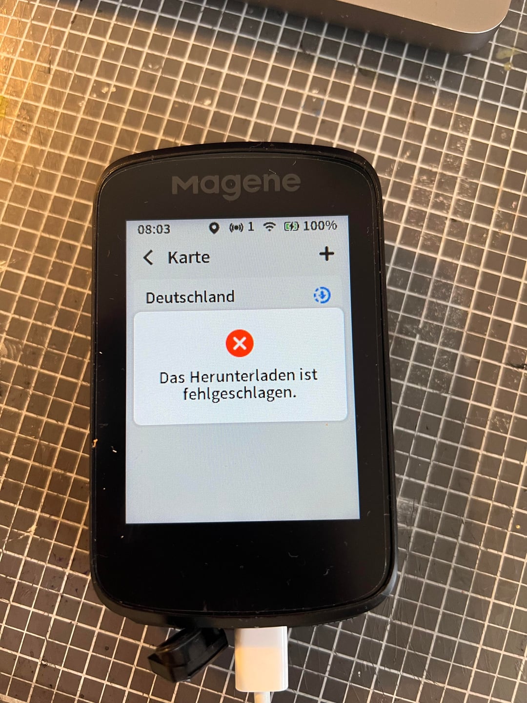 Even though the device is connected to power and shows 100% battery, I get an error message saying that the device needs to be charged – this message only appears when downloading the Germany map.