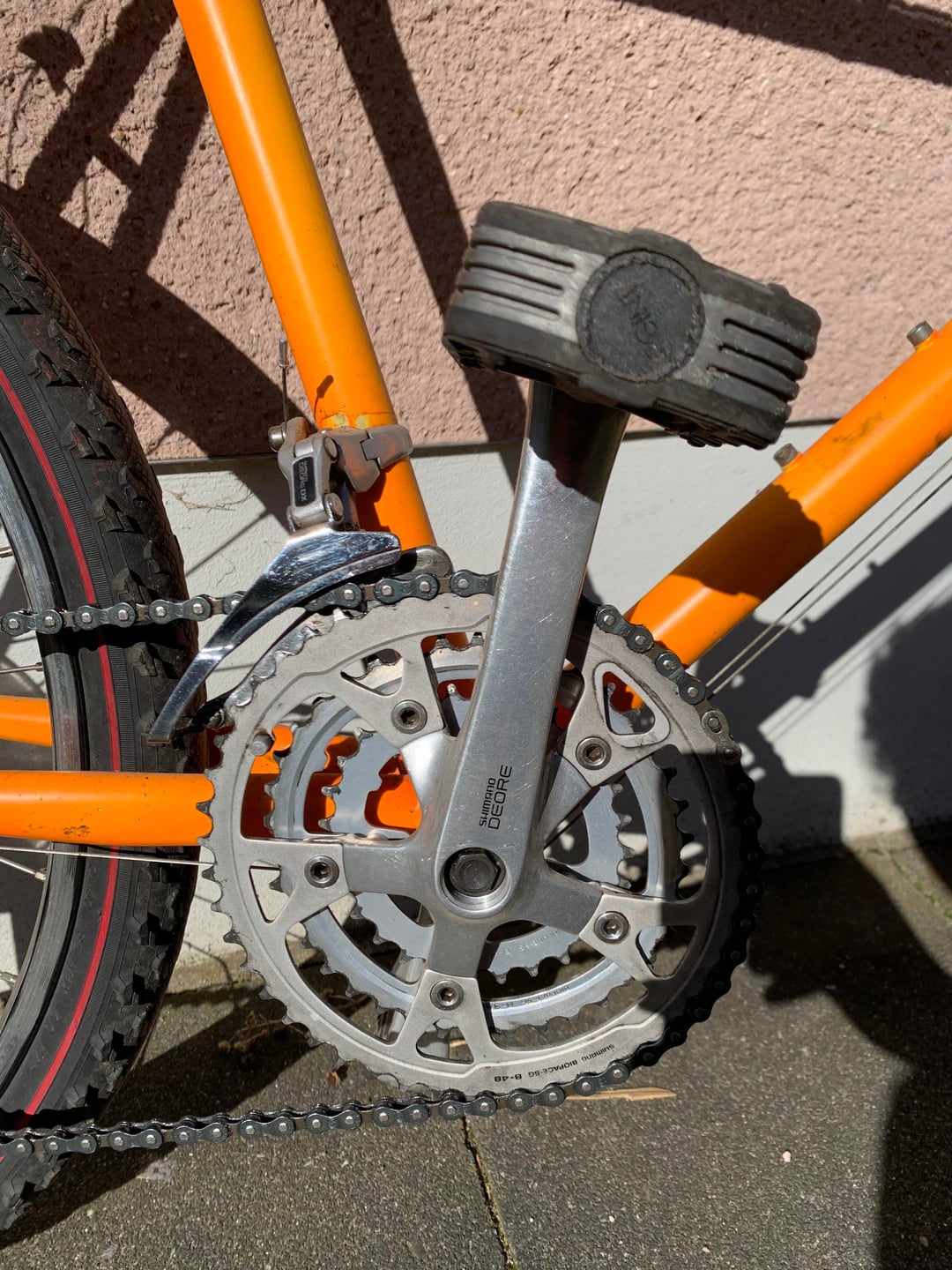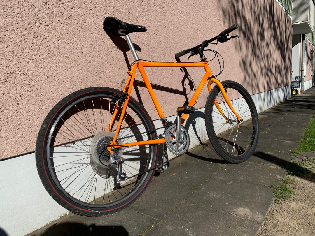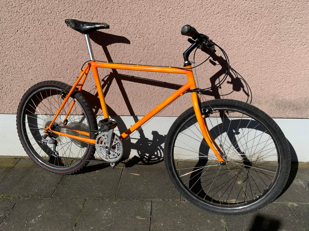 Wie viel kann ich für so ein Fahrrad mit "Herkunft unbekannt" verlangen? Ich habe damals etwa 150€ dafür bezahlt. Ist das ein fairer Preis? Die Teile (Antrieb, Schaltung, Bremsen, Bremsschalthebel) sind vorwiegend Shimano Deore DX / Biopace / SLR, die Laufräder haben Deore DX-Naben und Rigida-Felgen. Der Rahmen müsste CrMo sein.