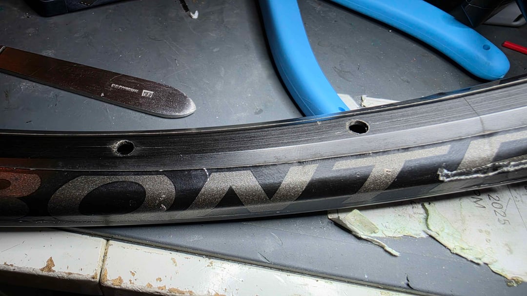 Was going to respoke the rear wheel as two spokes snapped during a commute. Noticed these cracks – there's 3 spoke holes with this left of where the hoop is joined together.